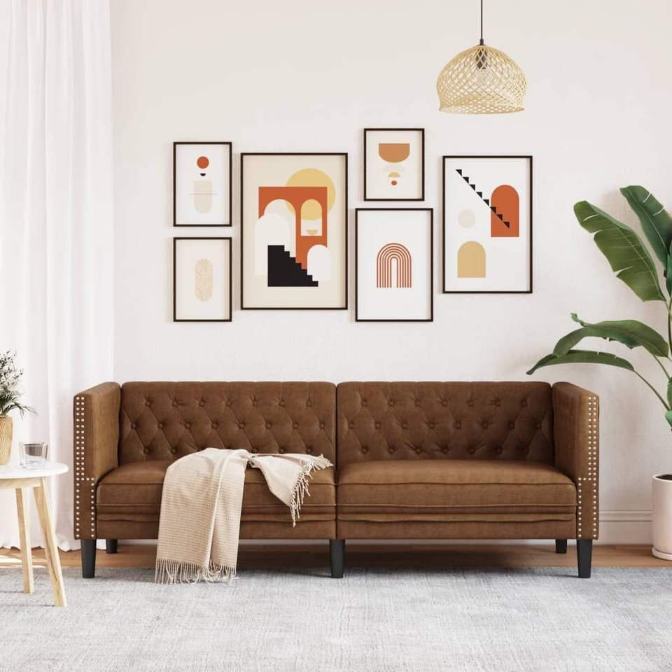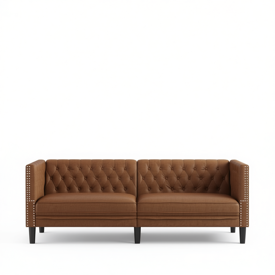 Divano Chesterfield Marrone per Soggiorno in Tessuto Trapuntato a Tre Posti con Braccioli Quadrati e Gambe in Legno