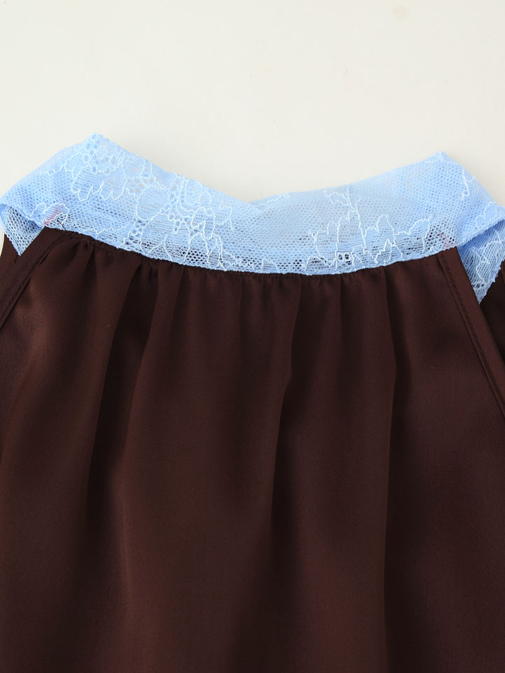 Brown Color Bow Tie Collar Lace Trim Casual Fashion Summer Sleeveless Tops Blouse for Women