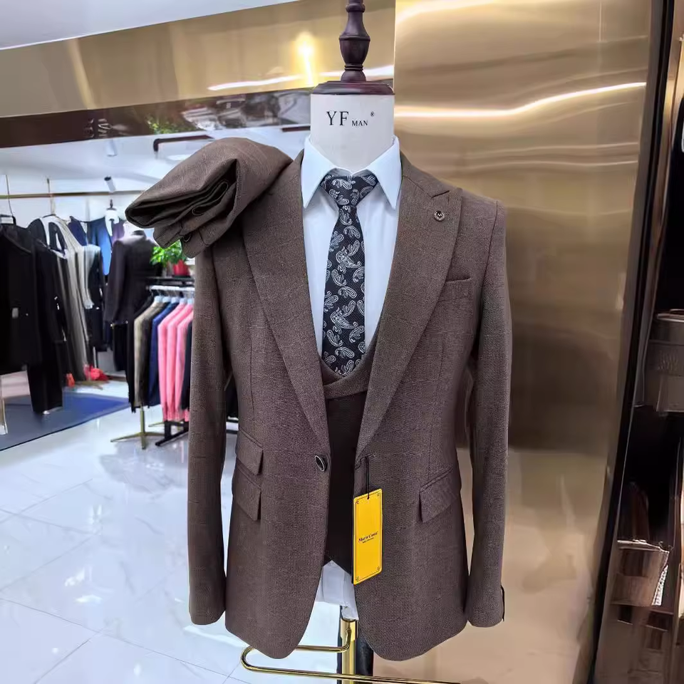 Completo Formale da Uomo Marrone 3 Pezzi Taglie Forti, Smoking Aderente Vintage Scozzese con un Bottone, Giacca, Gilet e Pantaloni