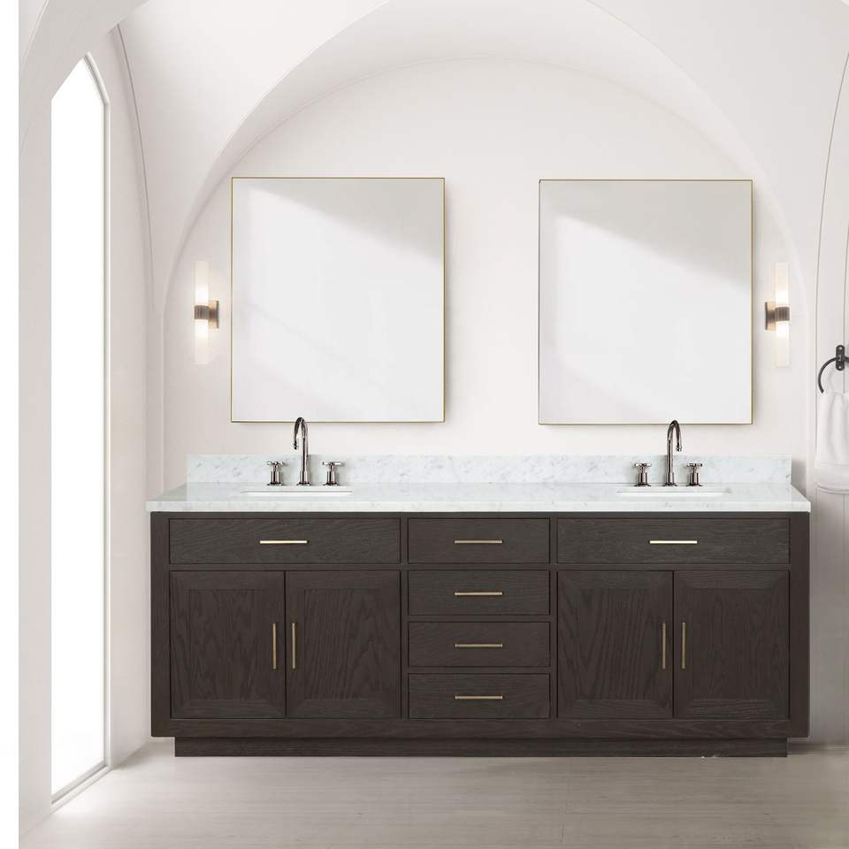Vanità da bagno doppio rovere marrone 84 In. Largo X 22 In. Profondo con piano In marmo di Carrara 36 pollici. Rubinetto Set 36 In. Specchietti 22 In. Alto