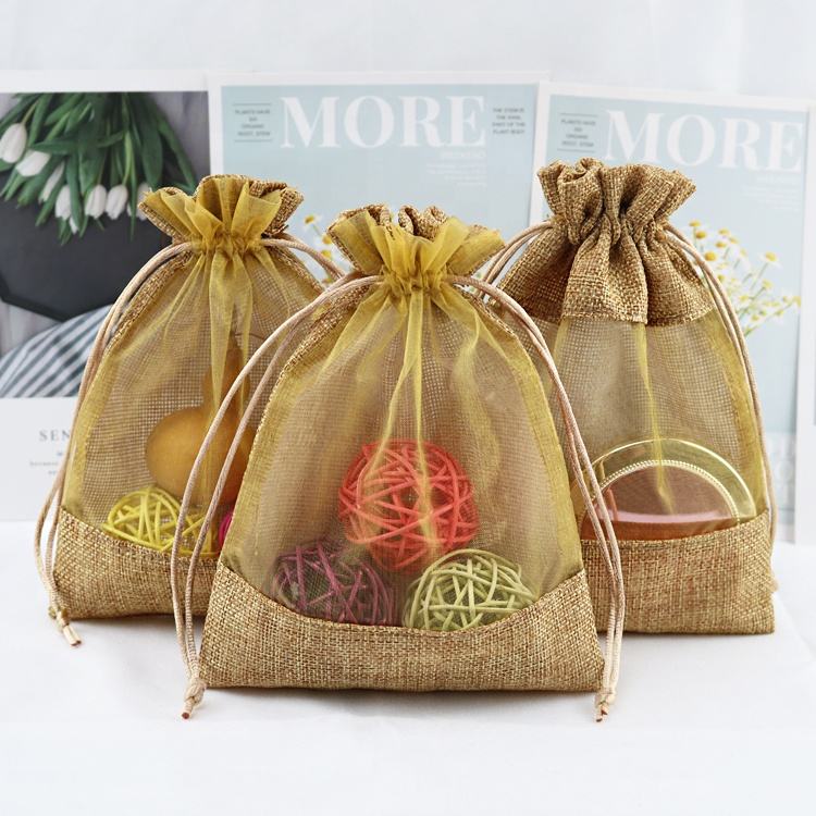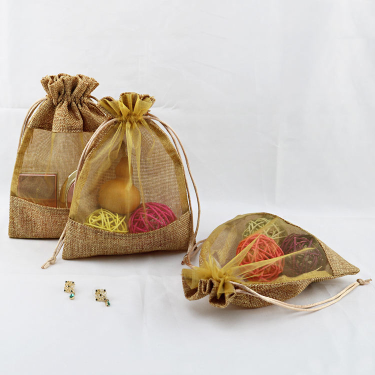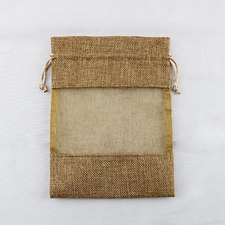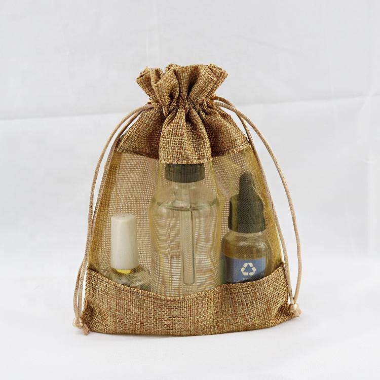 Marrone organza Finestra Sacco di iuta in juta Borsa con coulisse custom canapa sacchetti regalo con logo per cosmetici