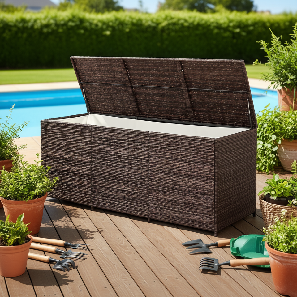 Contenitore da esterno in vimini sintetico marrone per attrezzi da giardino, cuscini, giocattoli da piscina, resistente all'acqua, rettangolare