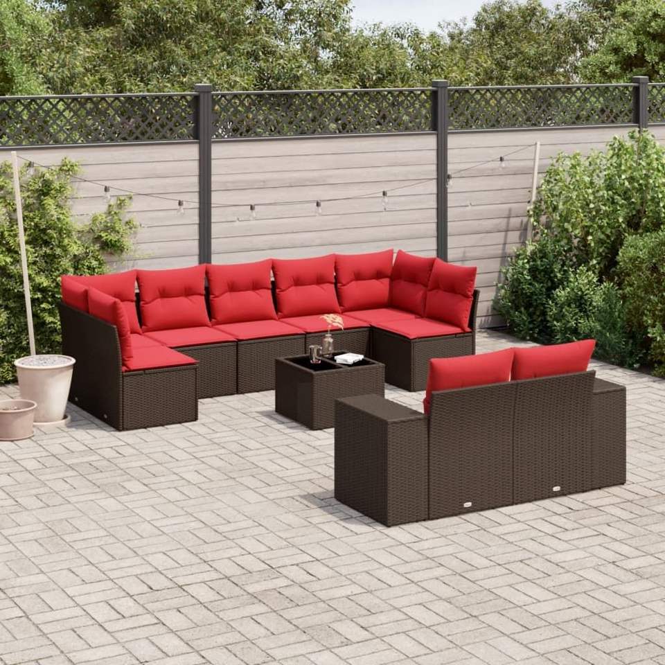 Set di divani da giardino in polyrattan marrone con cuscini, 10 pezzi, mobili da esterno in stile contemporaneo