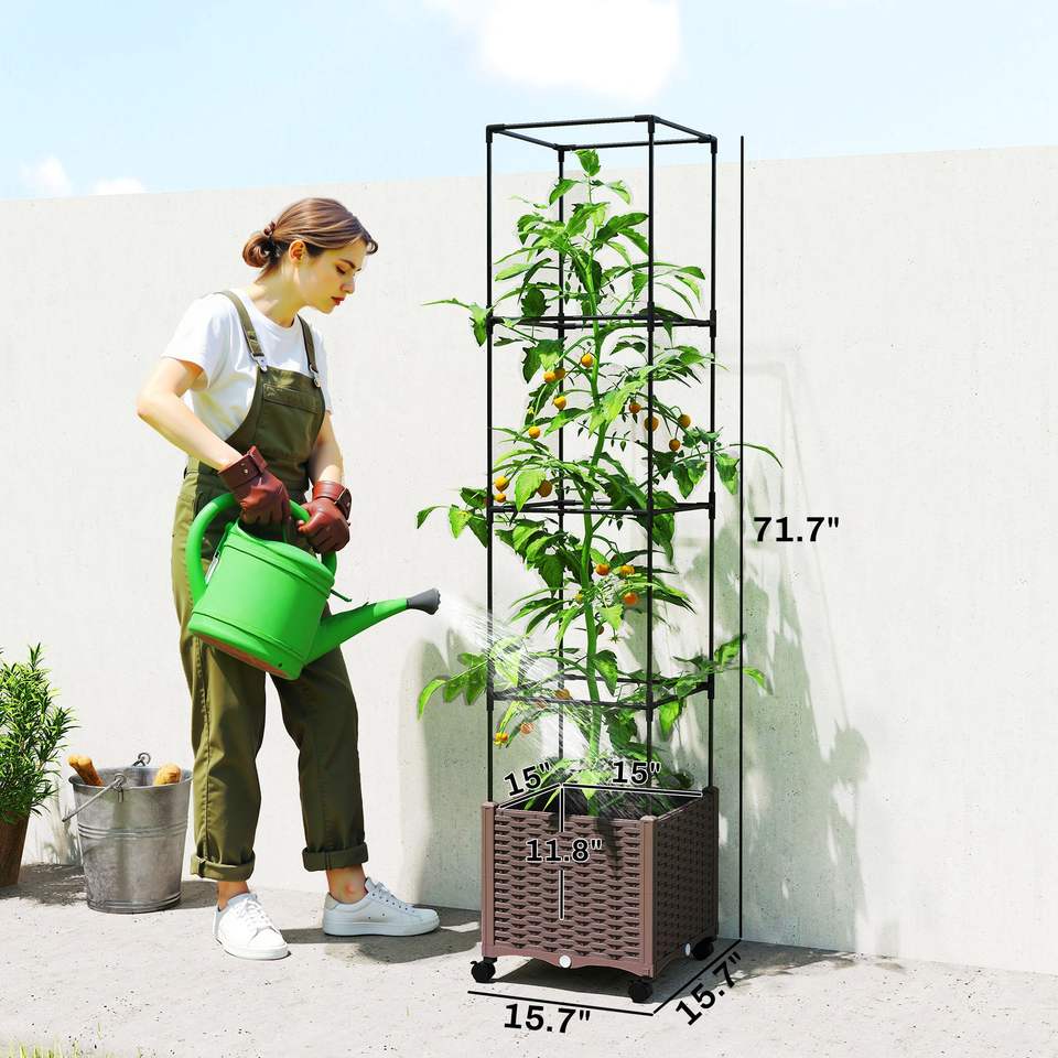 Fioriera Marrone Autoirrigante con Spalliera e Fori di Drenaggio, Ruote Bloccabili per Pomodori e Fiori