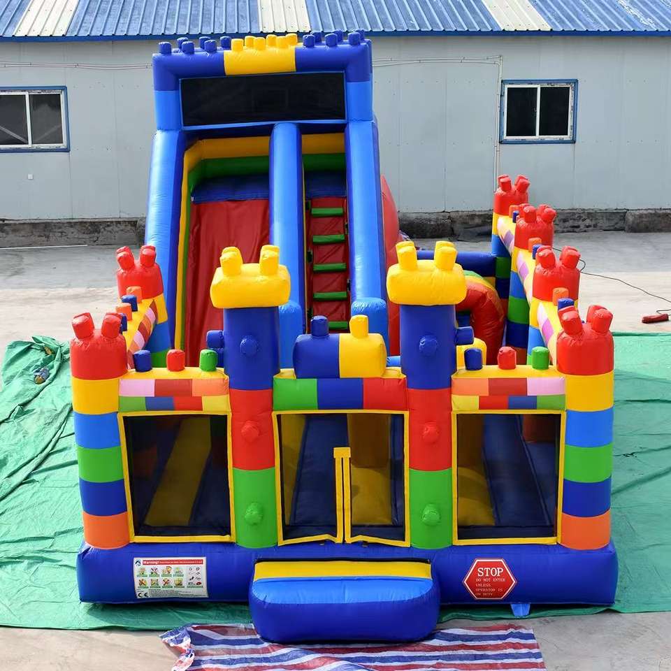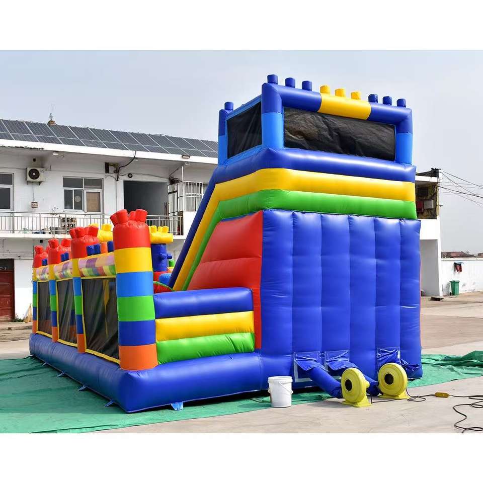 Blocco di costruzione a tema castello gonfiabile e scivolo combinato castello rimbalzante gonfiabile parco giochi al coperto per sfida a ostacoli