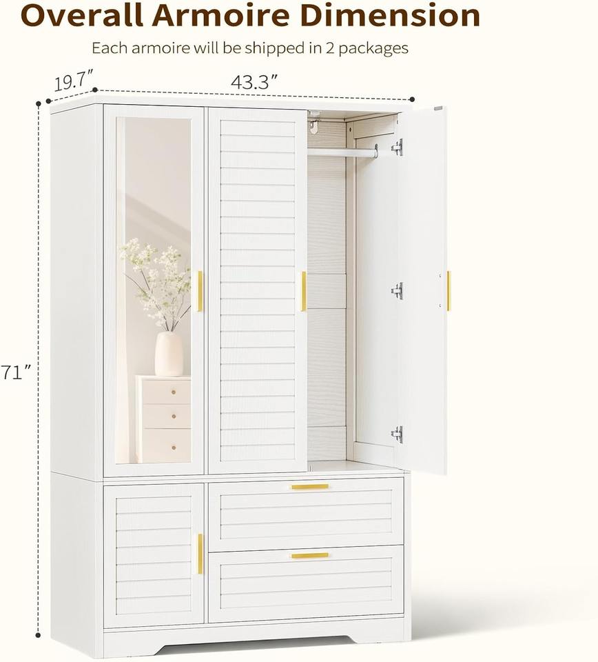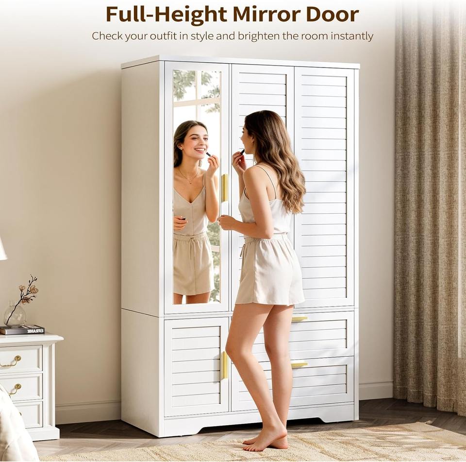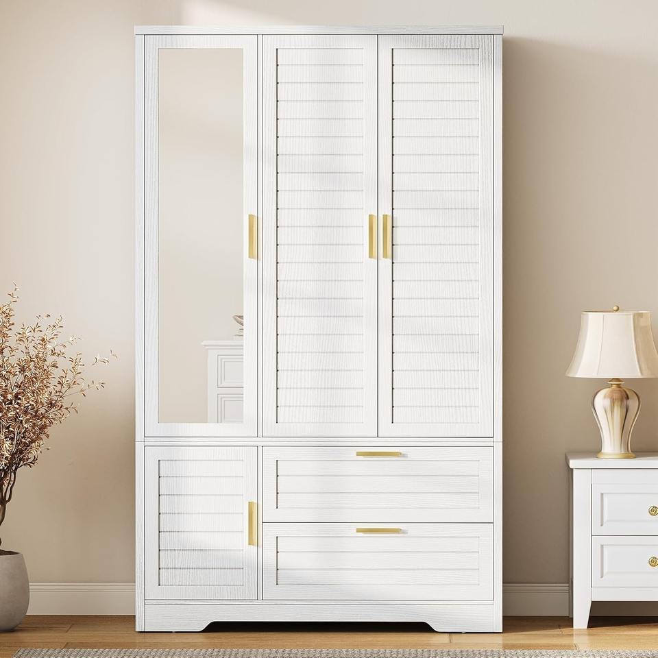 Armadio Guardaroba Autoportante Bianco in Legno Stabile con 3 Ante e Specchio per Ordini all'Ingrosso