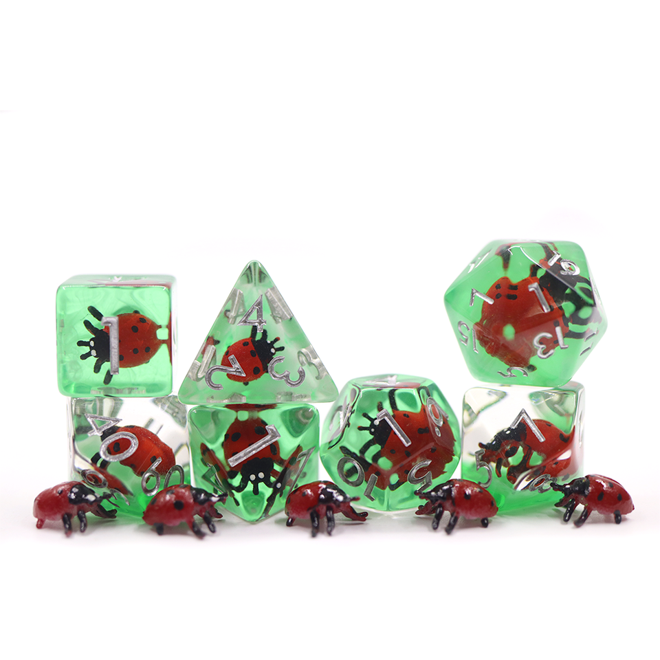 Set di Dadi Poliedrici Personalizzati all'Ingrosso, Dadi in Resina con Inclusioni di Coccinelle Rosse per Giochi da Tavolo DND