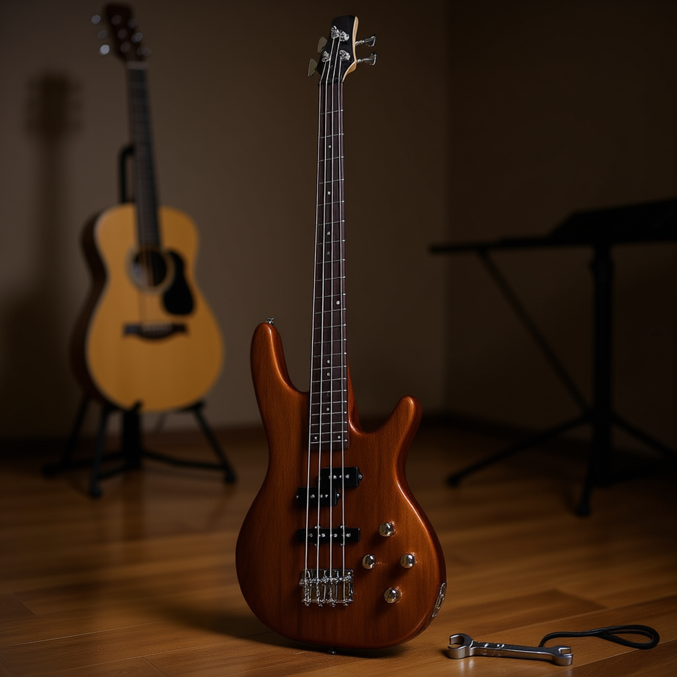 Basso Elettrico a 4 Corde Stile Ibanez Colore Burlywood con Pickup H-H, Manico in Acero, Finitura Laccata, Meccaniche Open Gear per Principianti