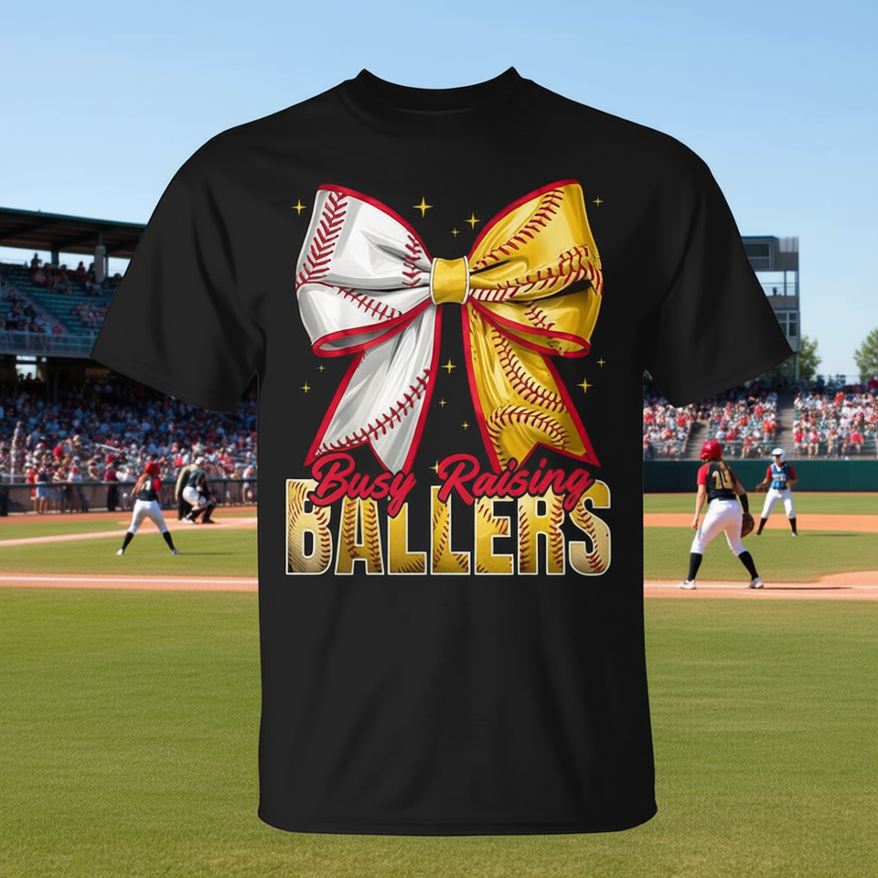 Maglietta da softball con scritta 'Busy Raising Ballers', abbigliamento per il giorno della partita