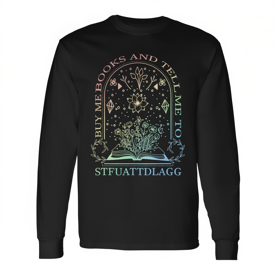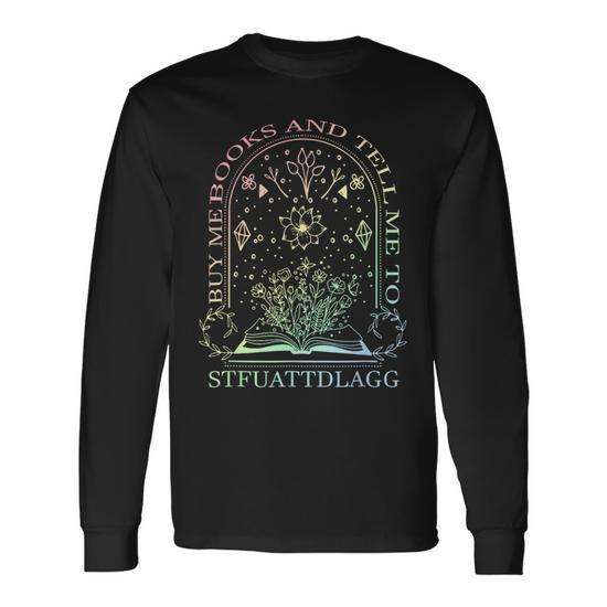 T-shirt a maniche lunghe Buy Me Books, abbigliamento promozionale con messaggio di incoraggiamento 'Stfuattdlagg'