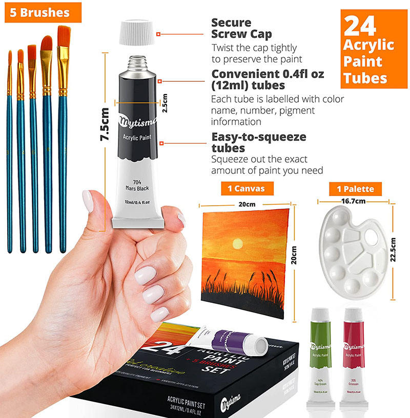 Bview Art Highly Pigmented 24 Vibrant Colors Acrylic Paint Set With 5 Pcs Paint Brush 1 Canvas Panel