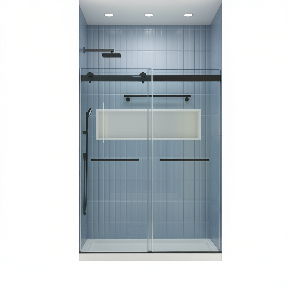 Bypass Sliding Shower Door 5/16 Inch Tempered Glass Matted Black Finish Rectangle Minimalist Design