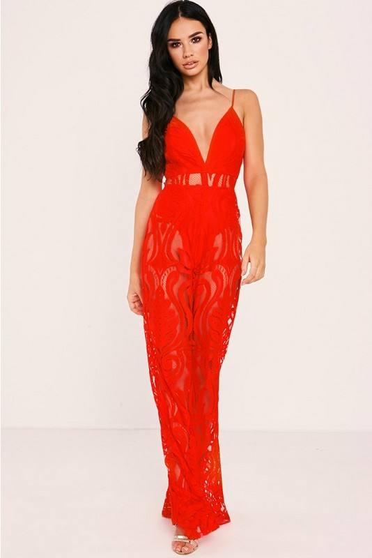 C1074 Migugarment Wholesale 2025 New Fashion Brand Celebrity Red Lace Long Jumpsuit Instock red color mesh design suit
