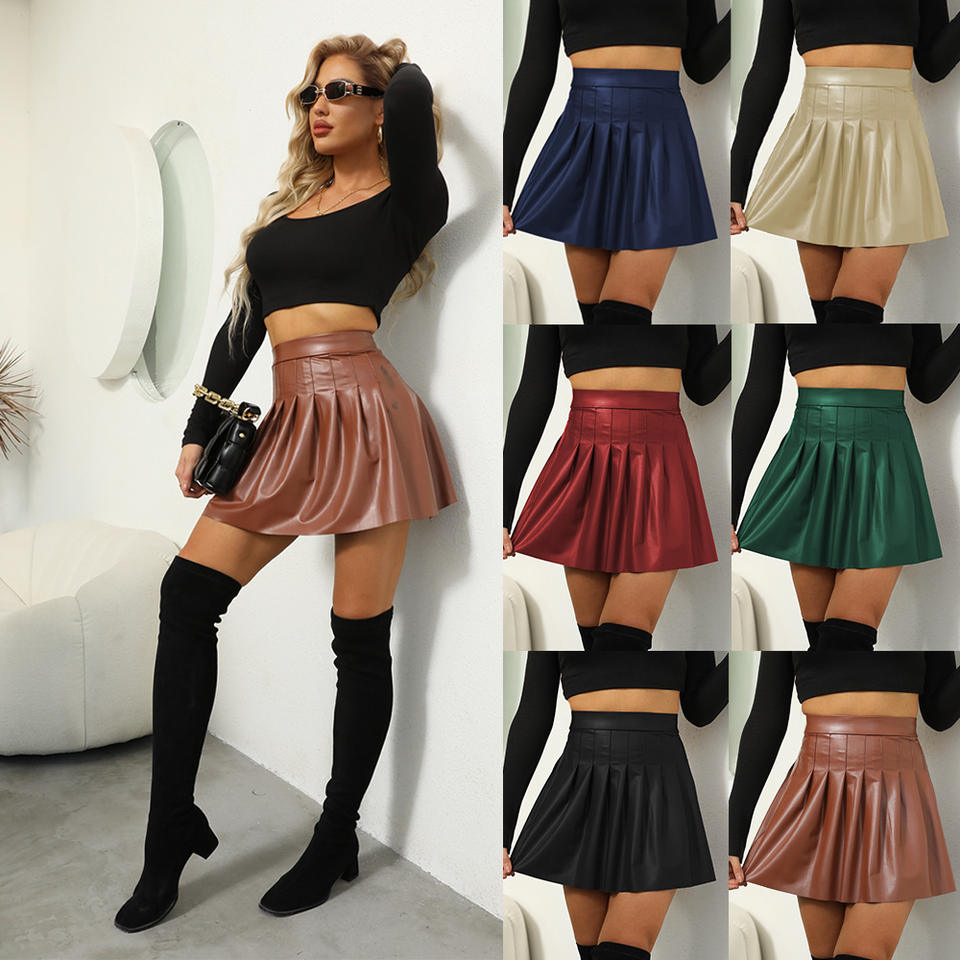 C1821 Popular Wholesale Spot Women's Solid Color PU Leather Pleated Mini Skirt Women