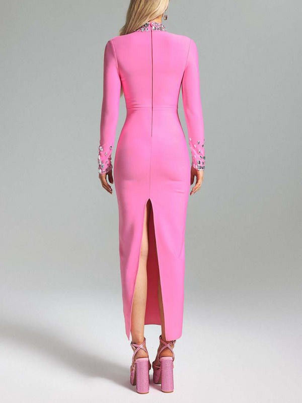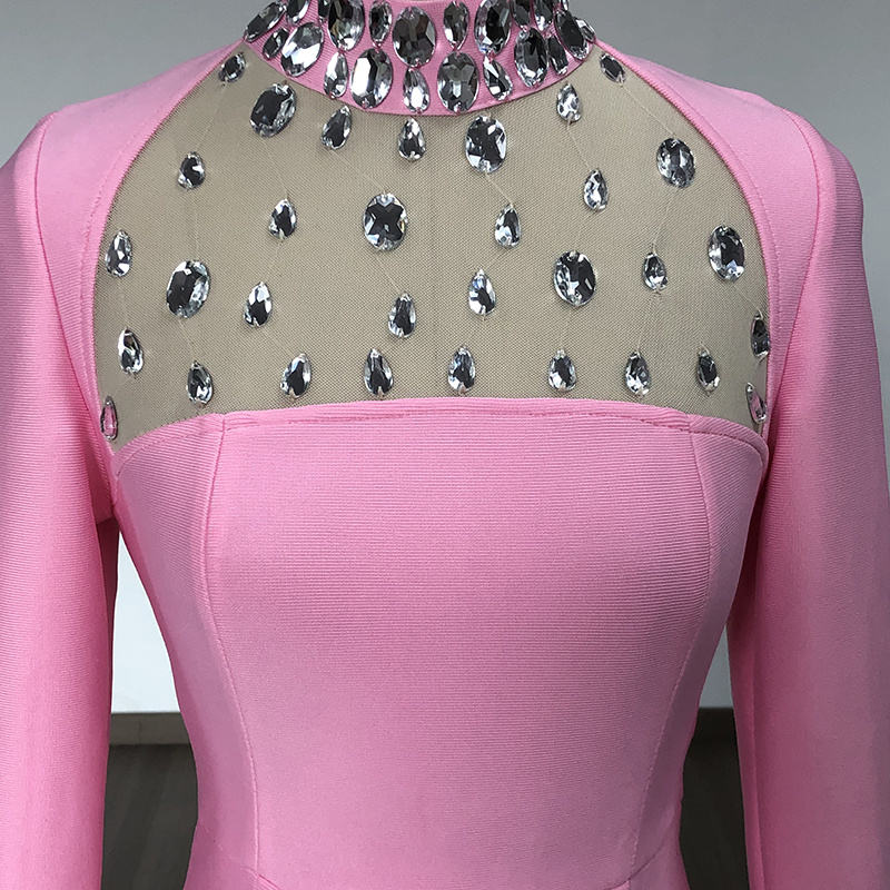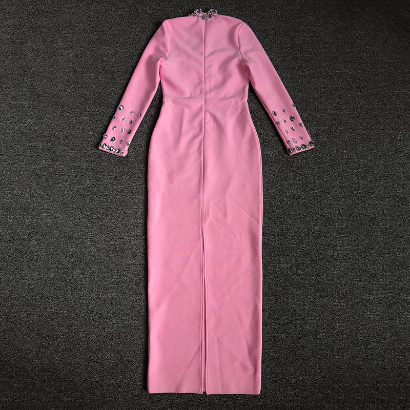 C3613 Ready to Ship Pink Women Knitted Midi Dress Beaded Long Sleeves Ladies Party Dress