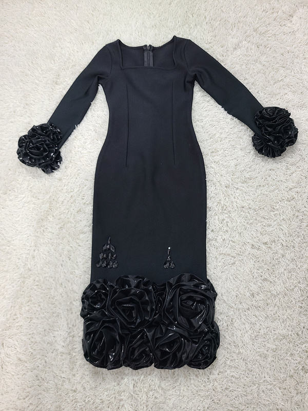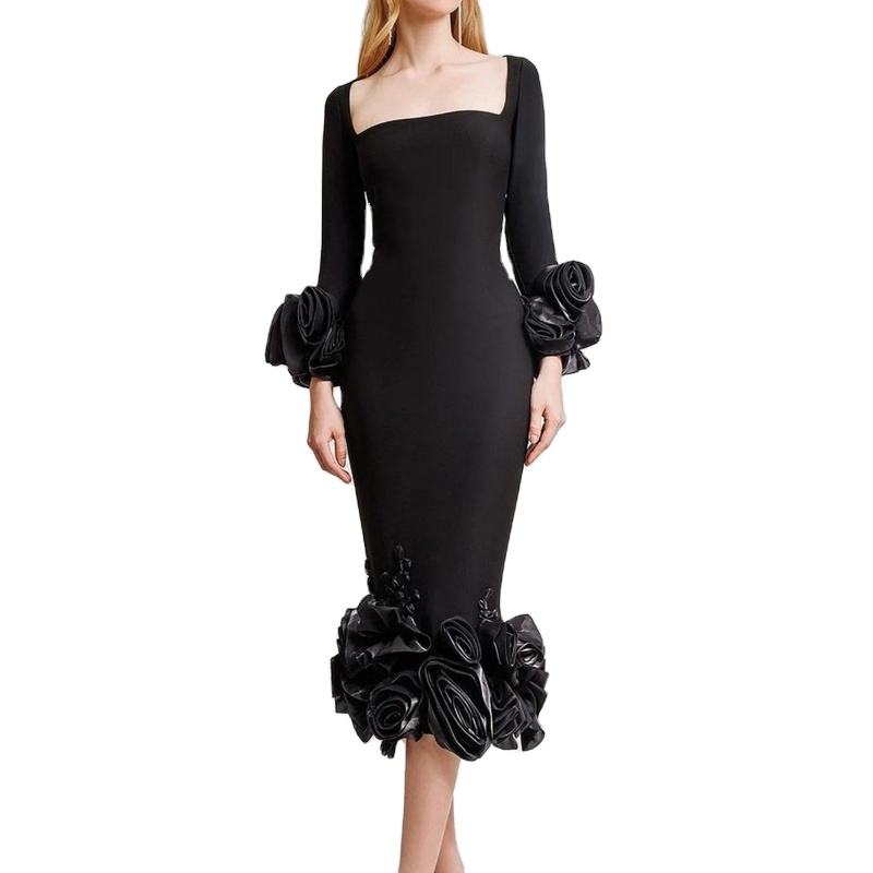 C3724 European Style Long Sleeves Women Knitted Midi Dress Black Elegant Ladies Evening Dress