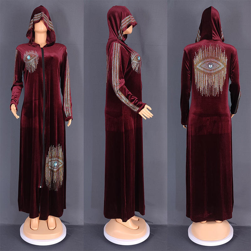 CCY Hot Selling Nigeria Ladies Muslim Velvet Party Dress With Rhinestone Abaya Winter Long Sleeve Women Dresses
