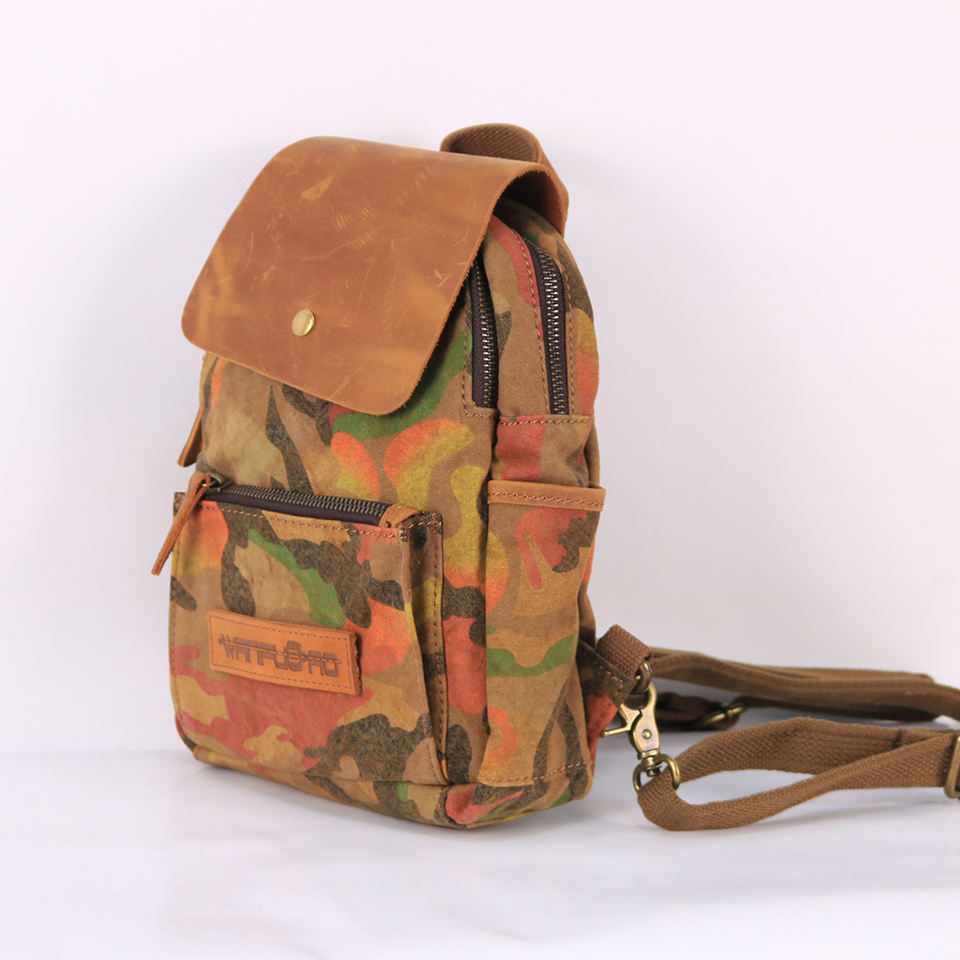 Constracture:Zipper closure, snap button, leather flap, poly/cotton shoulder strap