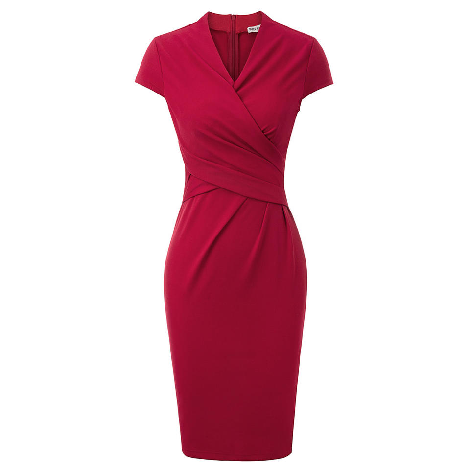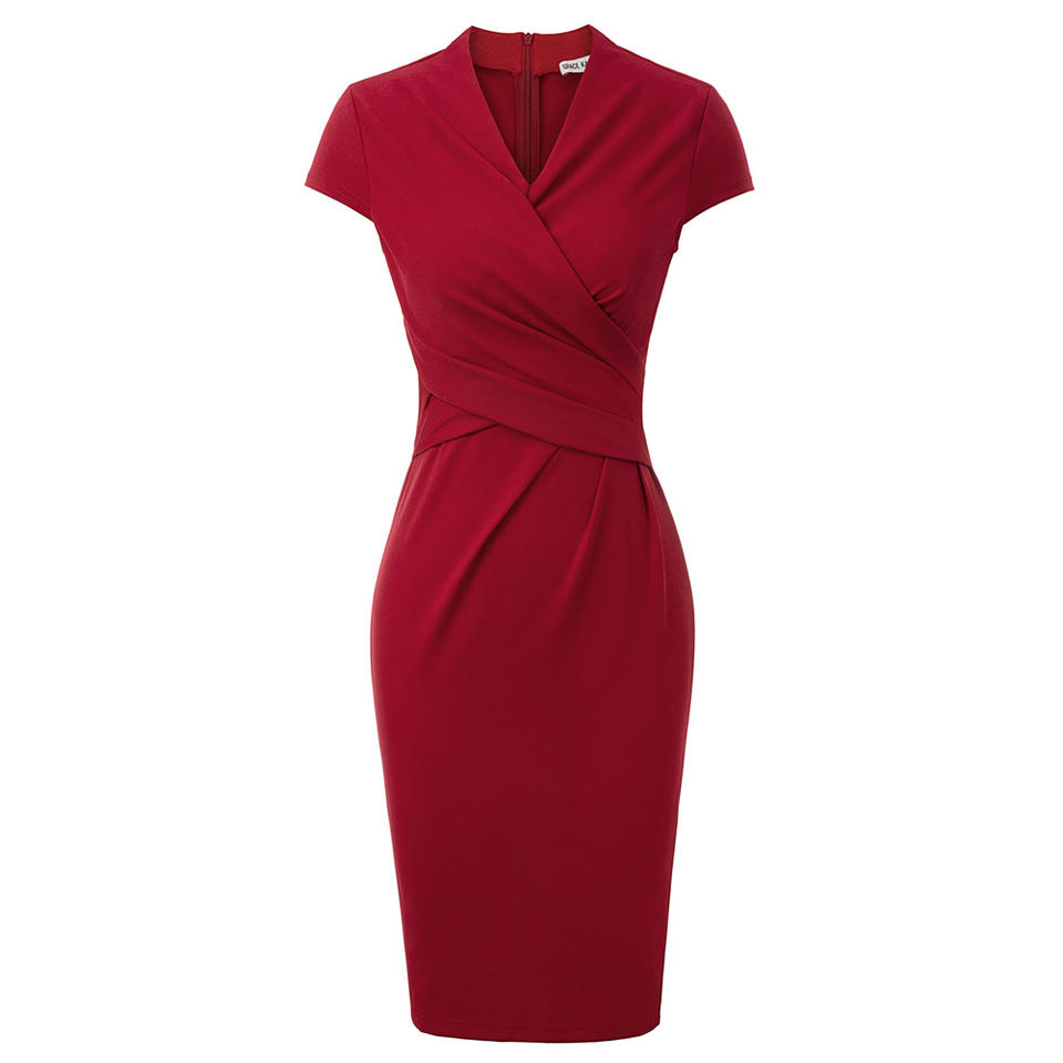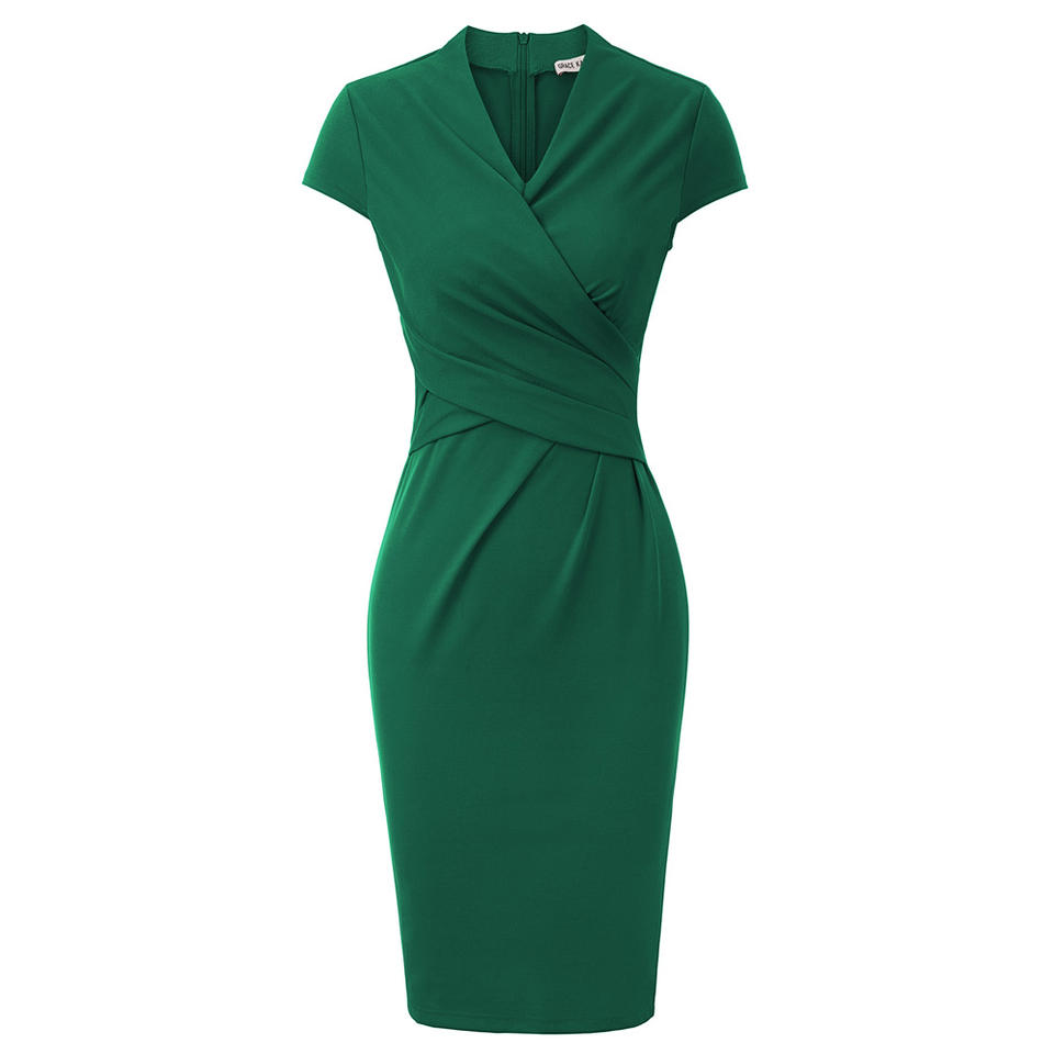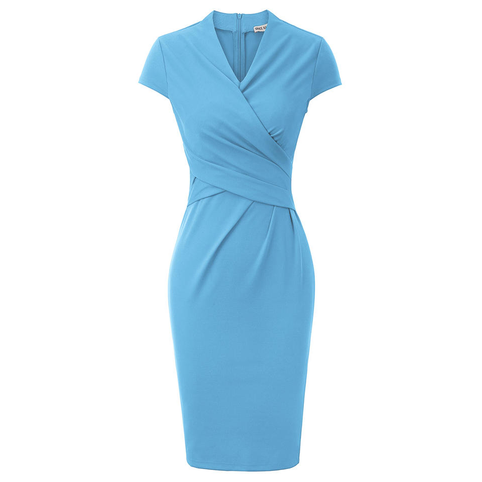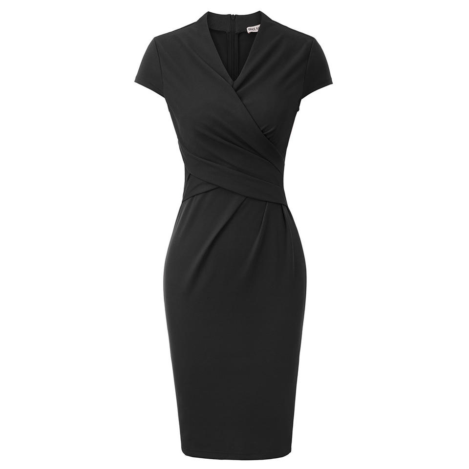 CLE02037 GK Fashion Womens Pleated Pencil Dress Short Sleeve Surplice V-Neck Hips-Wrapped Black Bodycon Dresses
