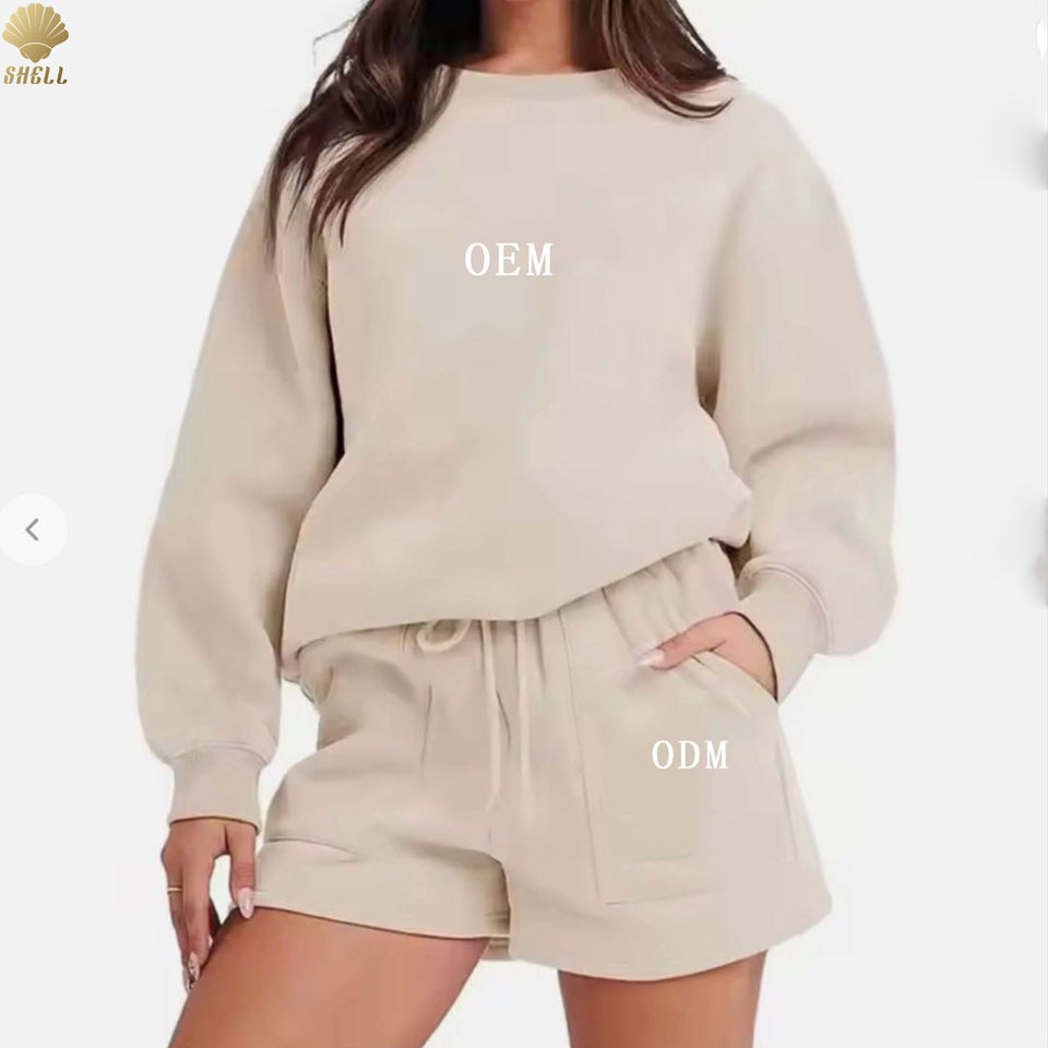 CNSHELL High Quality 365GSM Cotton Fleece No Hooded Sweatshirt and Draw String Shorts With Pocket 2 Piece Set Women