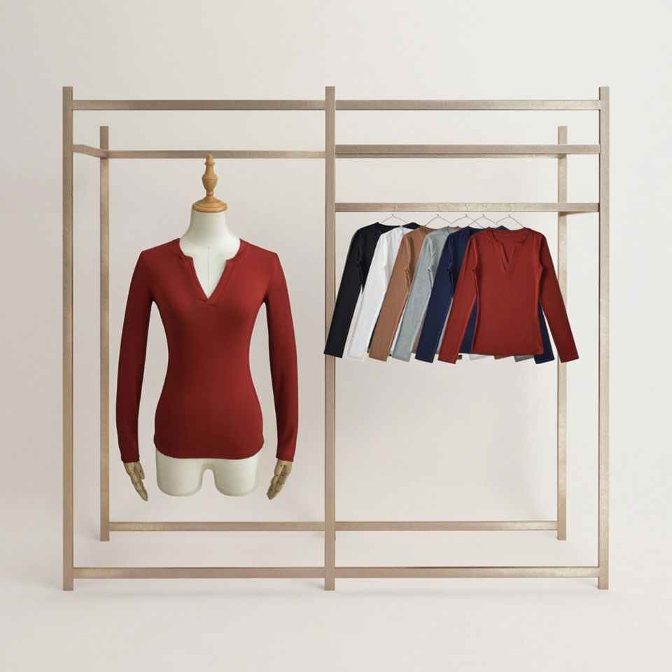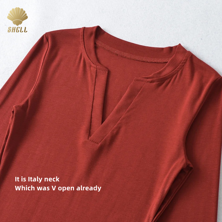 CNSHELL Red Women's Casual Crew Neck Open Italy Neck V Cut Long Sleeve Top Basic Slim Fit Elastic T Shirt Soft Cotton