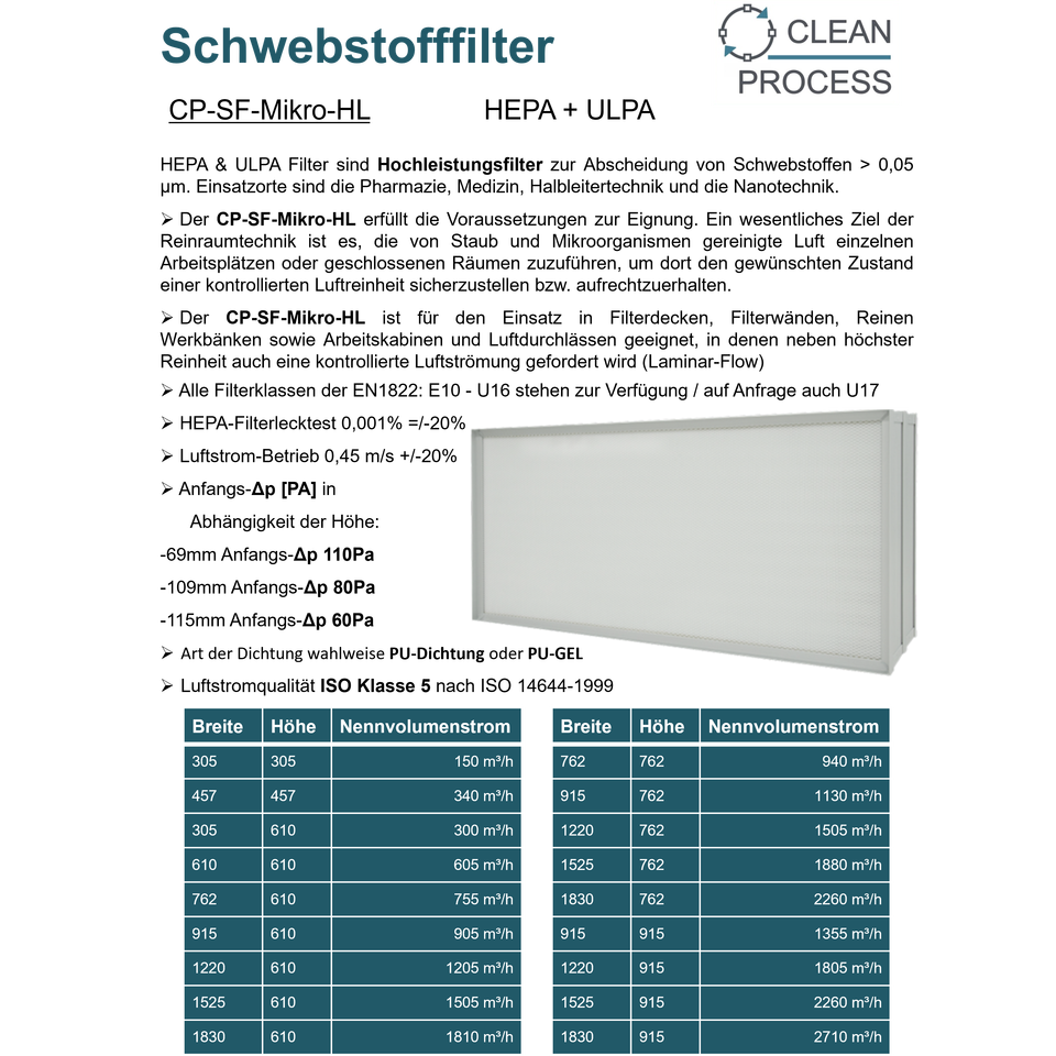 Filtro per particelle sospese CP-SF-Micro-HL / HEPA & ULPA EN1822-1 DEHS: E10 - U17 per aria sterile e camere bianche