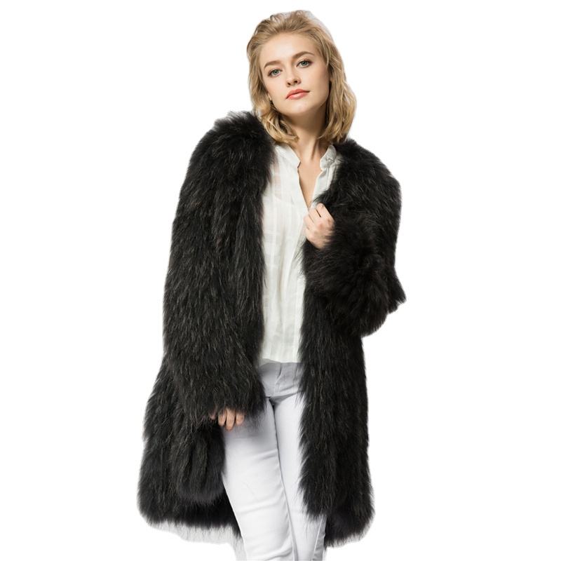 CR061 Knitted Real Raccoon Fur Coat Jacket Overcoat Russian Women's Winter Warm Genuine Fur Coat Outwear 90 cm Length