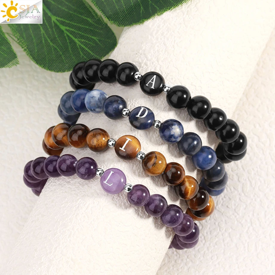 CSJA Natural Stone Round Beaded A-Z Initial Gemstone Healing Rose Quartz Tiger Eye Crystal Letter Bracelets for Men Women H282