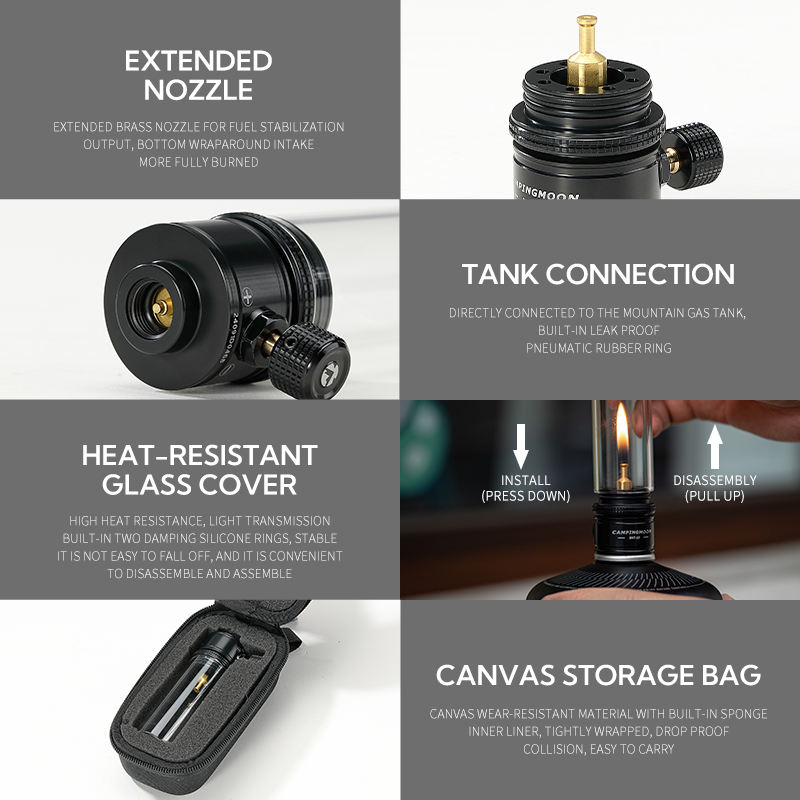 Campingmoon accessori campeggio leggero personalizzato nero portatile squisito campeggio butano gas lanterna a gas per esterni lampada a gas