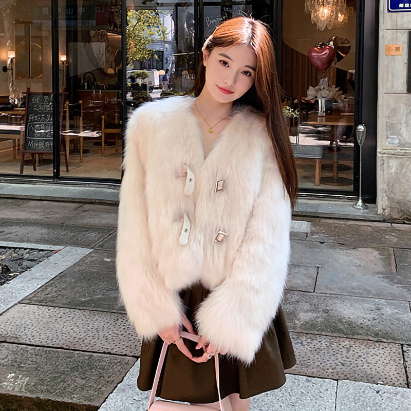 Giacche in Pelliccia Corta con Scollo a V in Colori Pastello, Elegante Cappotto in Pelliccia di Volpe per Donna Invernale