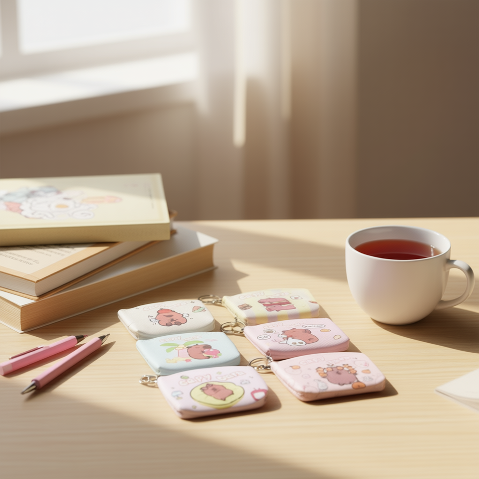 Portamonete Capybara 10x8,5 cm con cerniera, design a cartone animato per ragazze e donne, mini portafoglio portatile con portachiavi