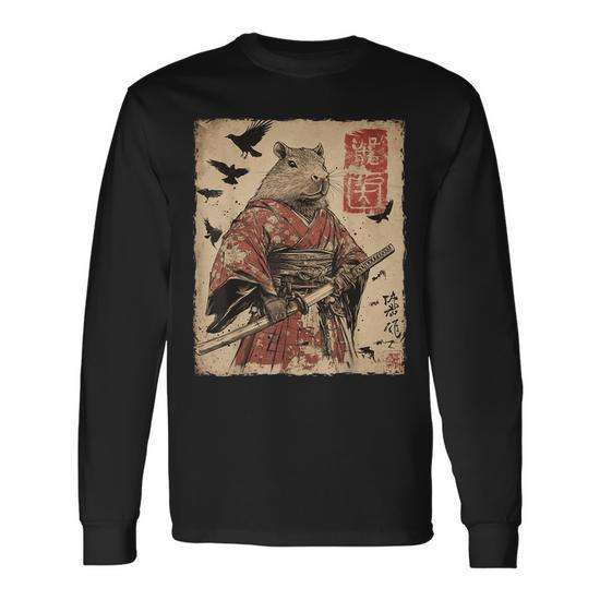 T-shirt a maniche lunghe con grafica Capybara Samurai, guerriero giapponese, anime