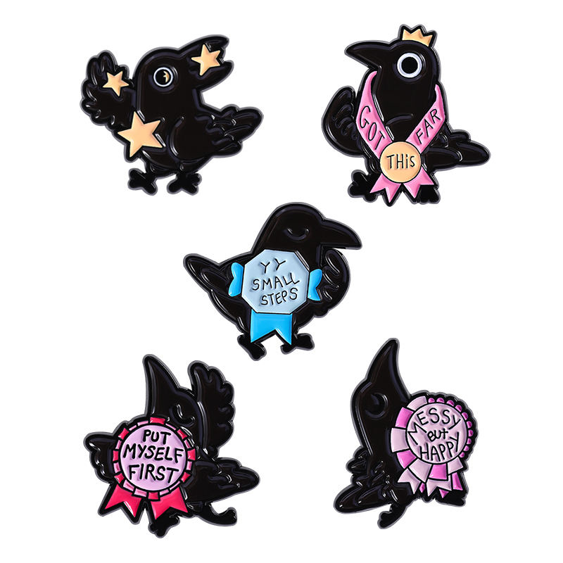 Spilla in smalto personalizzata a forma di corvo dei cartoni animati, con scritta 'Ponimi prima di me, disordinato ma felice', distintivo da risvolto per abbigliamento, gioielli a tema animale, regali