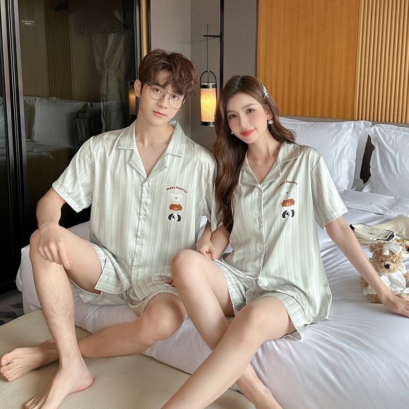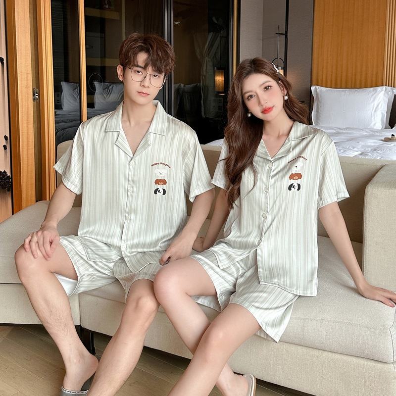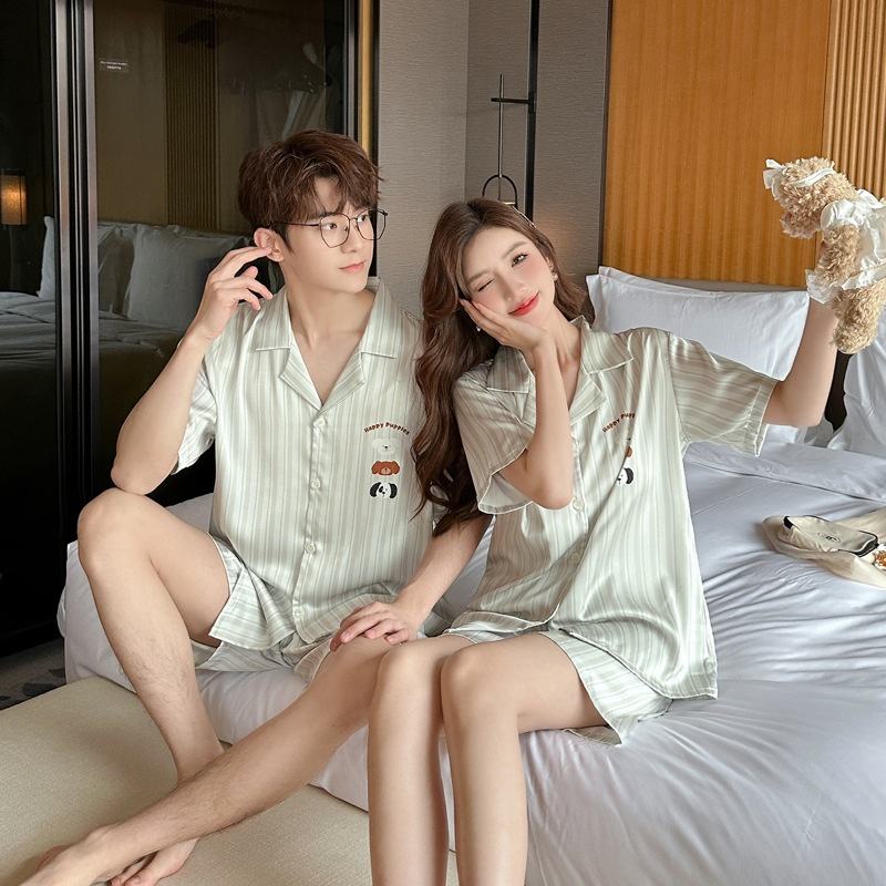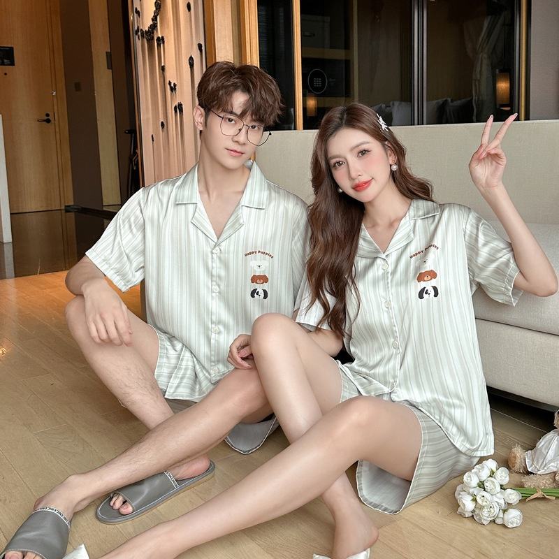 Pigiama Estivo Traspirante a 2 Pezzi con Stampa di Cuccioli Cartoon, per Uomo e Donna, in Seta Ghiacciata, Maniche Corte e Pantaloncini, Taglie Grandi