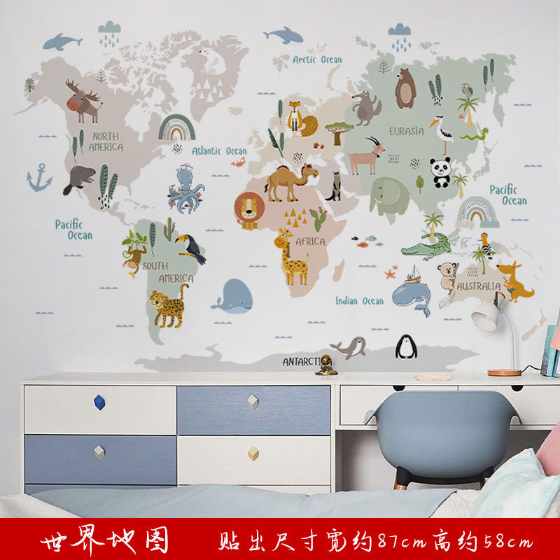 Cartone animato mondo animale mappa PVC adesivi da parete per educazione della prima infanzia autoadesivo scuola materna classe decalcomania