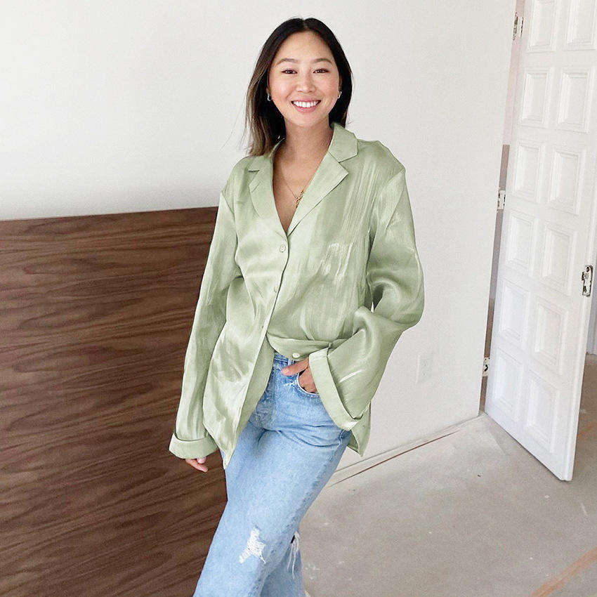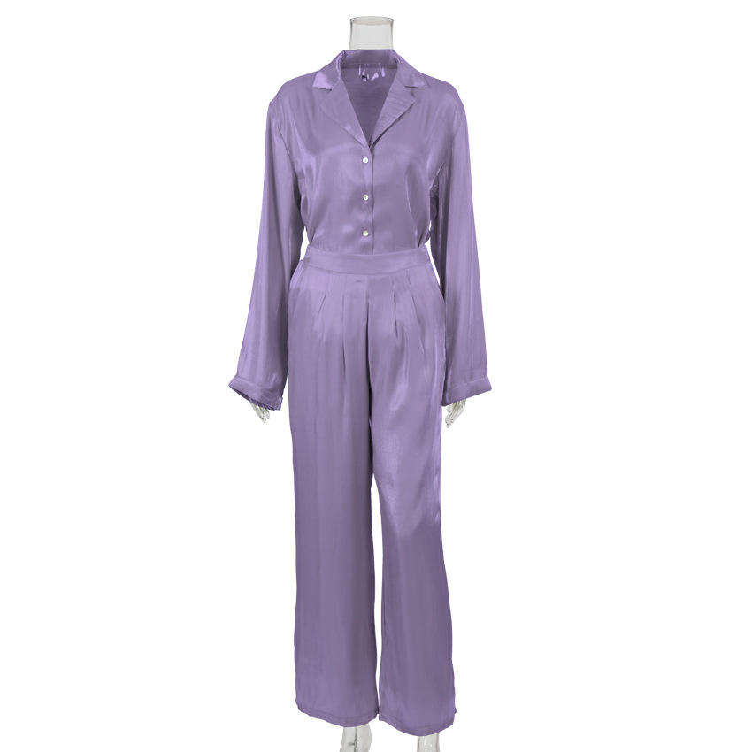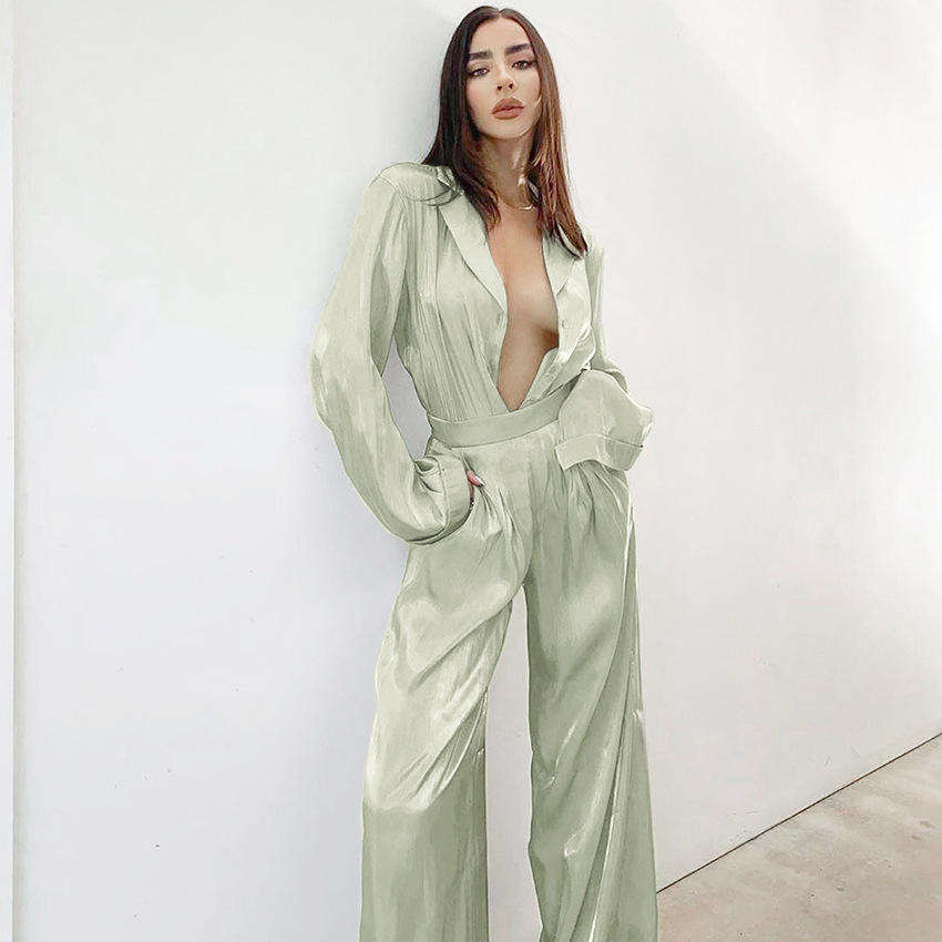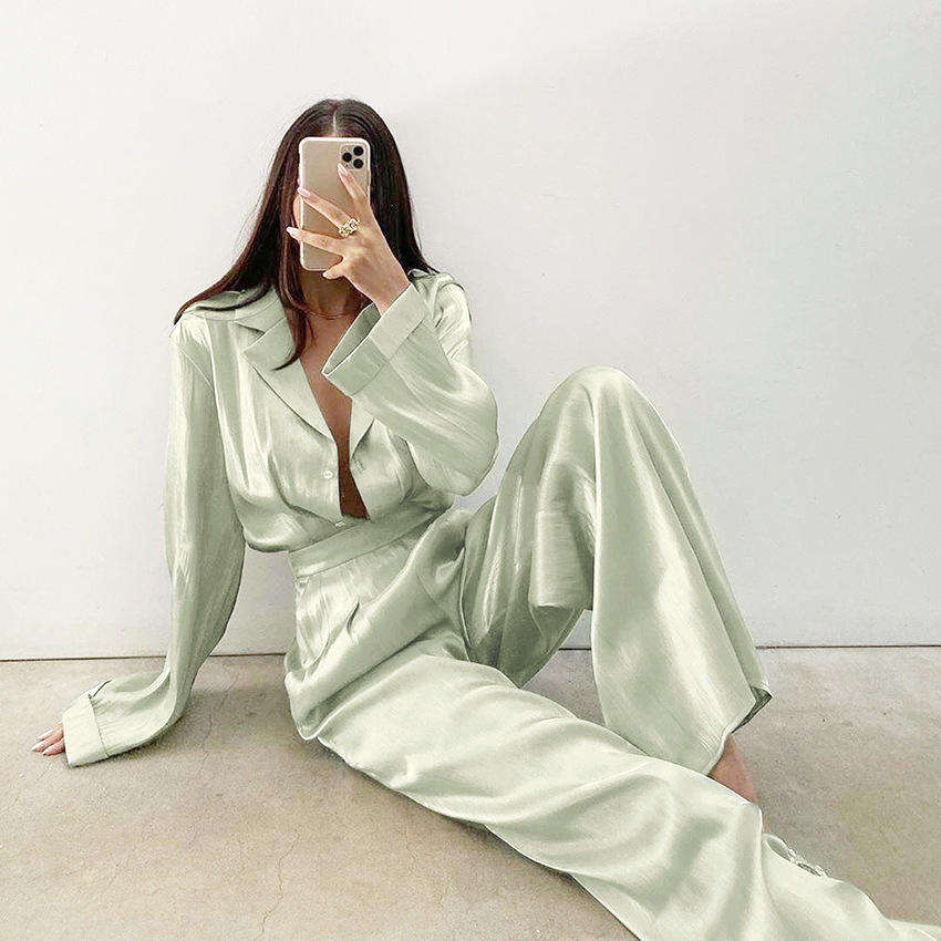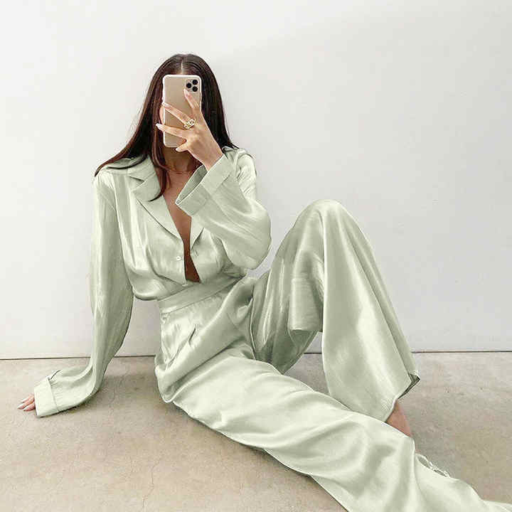Merce in contanti punto sottile seta signore temperamento verde due pezzi raso abiti manica lunga pigiama per il tempo libero