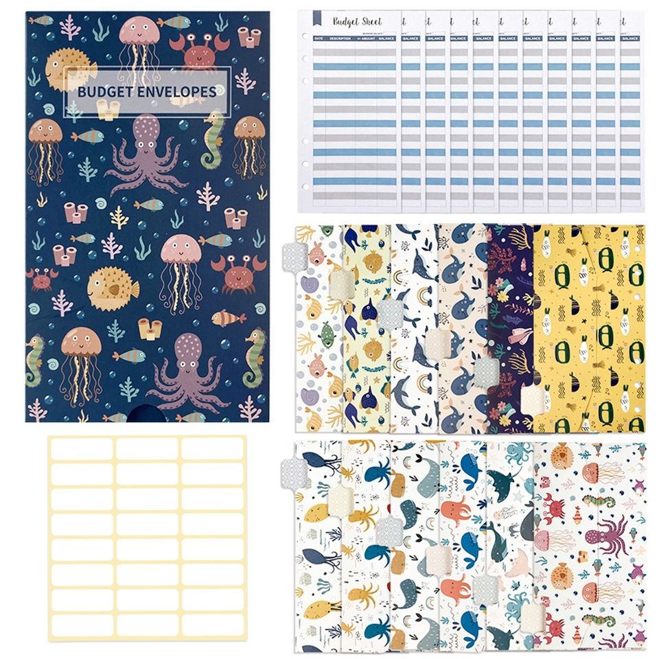 Sistema di buste per contanti, 12 buste riutilizzabili in plastica per il budget, 12 fogli per il monitoraggio delle spese e 24 adesivi per la pianificazione delle bollette