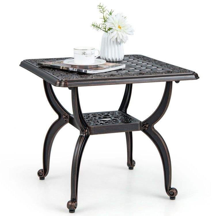 Tavolino da Esterno in Alluminio Pressofuso con Ripiano Portaoggetti per Giardino, Portico e Balcone