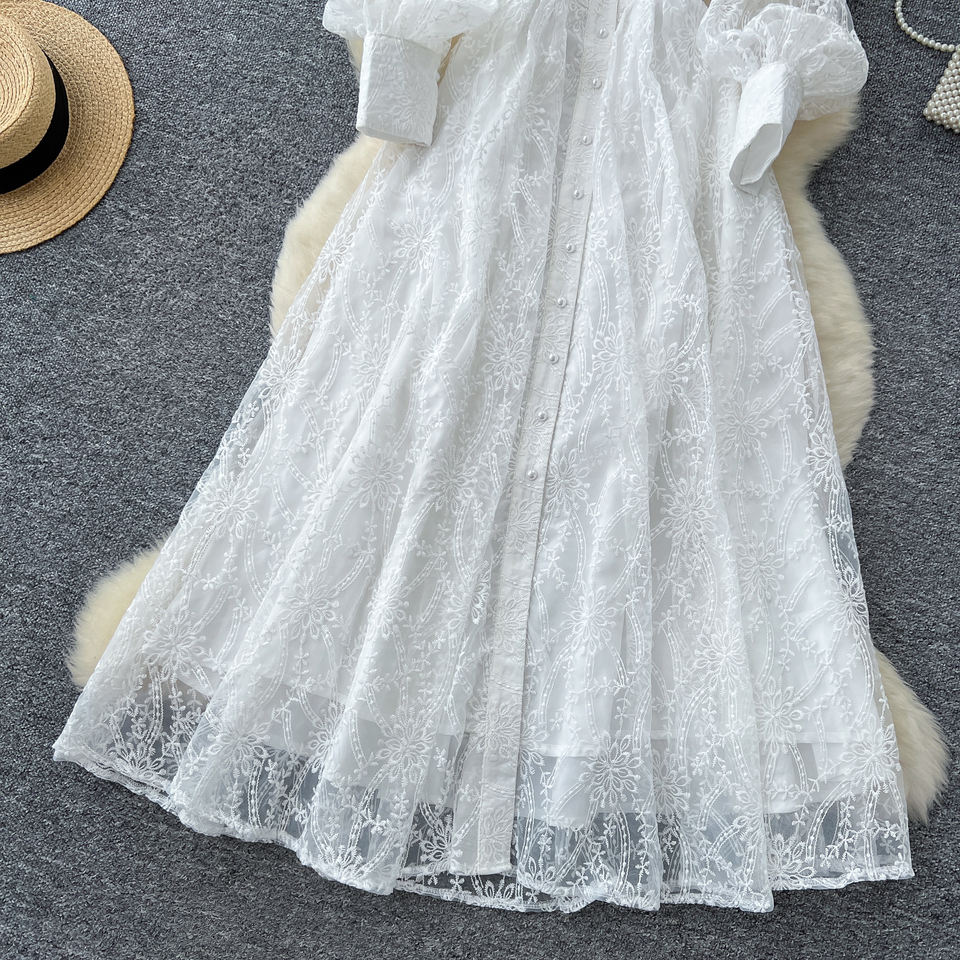 Casual Dressesvintage Elegant Women'S Dress Stand Collar Single Button Waist Embroidery Tulle Long Dresses for Ladies