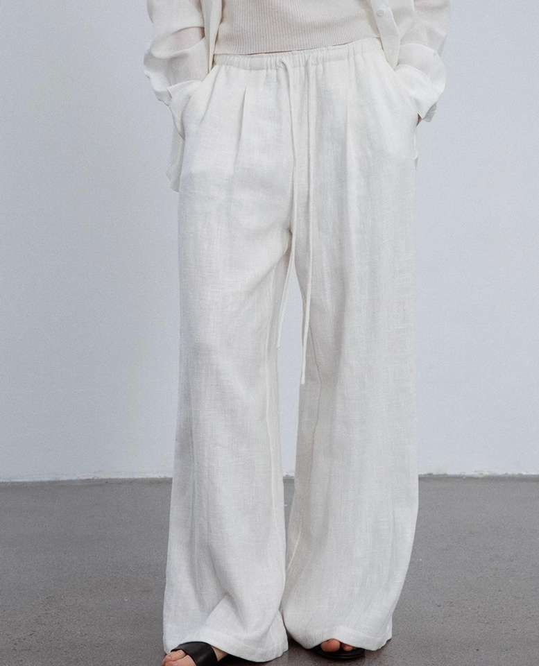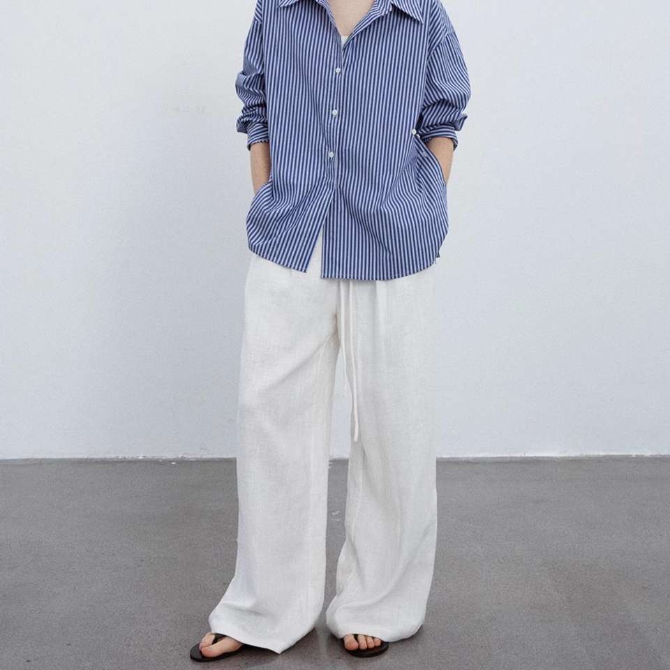 Camicia a maniche lunghe e pantaloni dritti con motivo solido Set a due pezzi di lino Casual alla moda