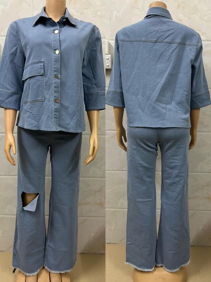 Casual Fashion Women's Denim Two-Piece Suit Large Size Spliced Shirt and Short Sleeved Loose Jeans for Summer