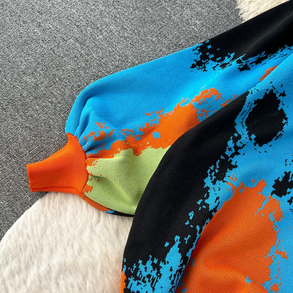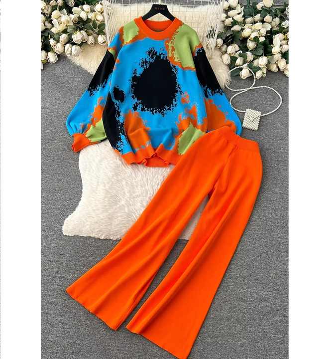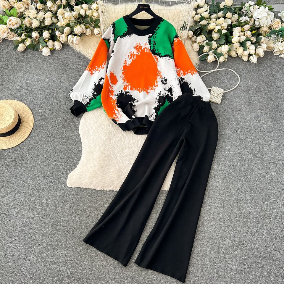 Casual Loose 2 Piece Set for Women Top and Printed Knitted Pants Set American Clothing Wholesale