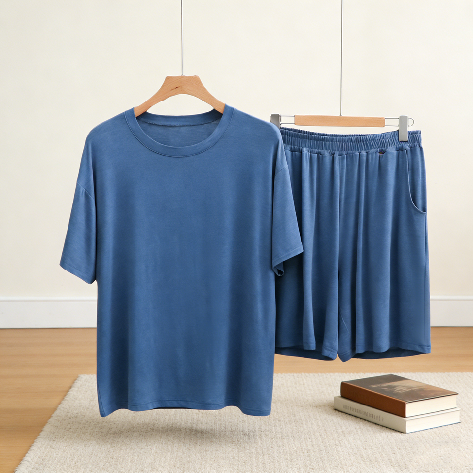 Pigiama Casual in Modal Taglie Forti, Completo Due Pezzi Elasticizzato con Girocollo e Maniche Corte, Pantaloncini Estivi da Casa, Abbigliamento da Notte da Uomo