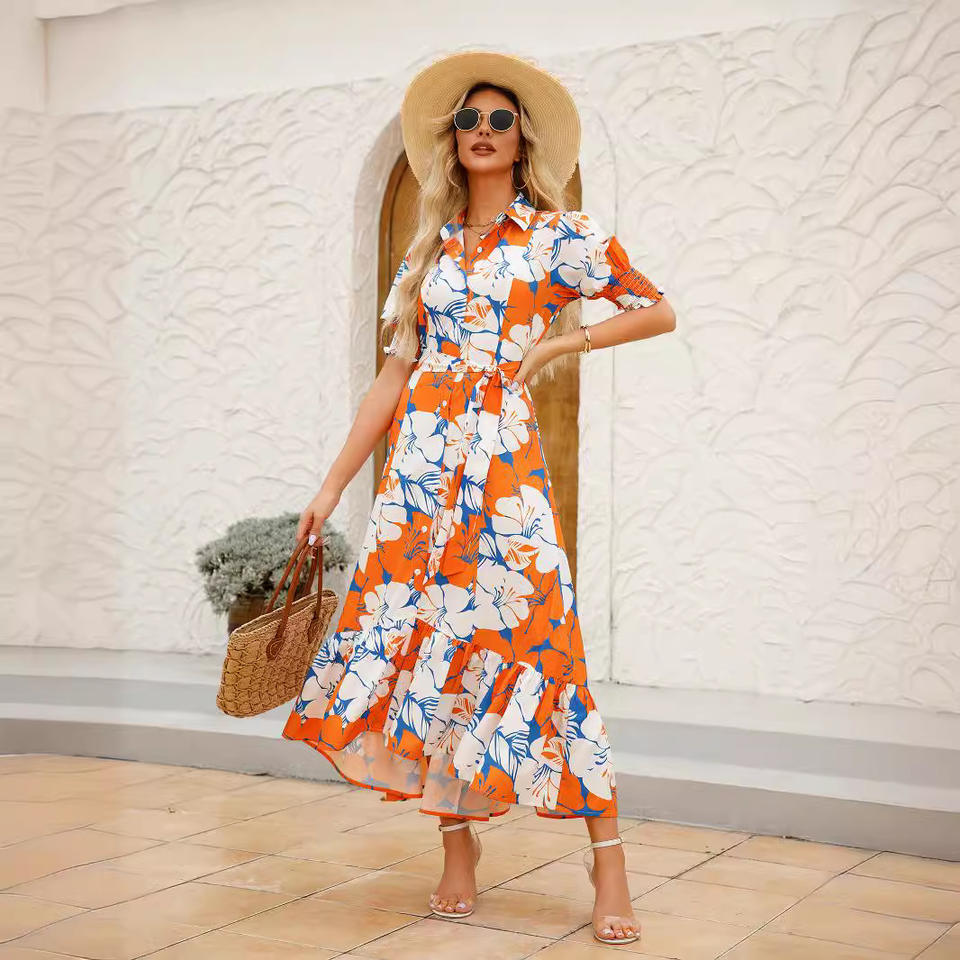 Casual Printed POLO Collar Waist Maxi Dress XL Size Summer Daily Use Shirt with Digital Prints Autumn Patterns