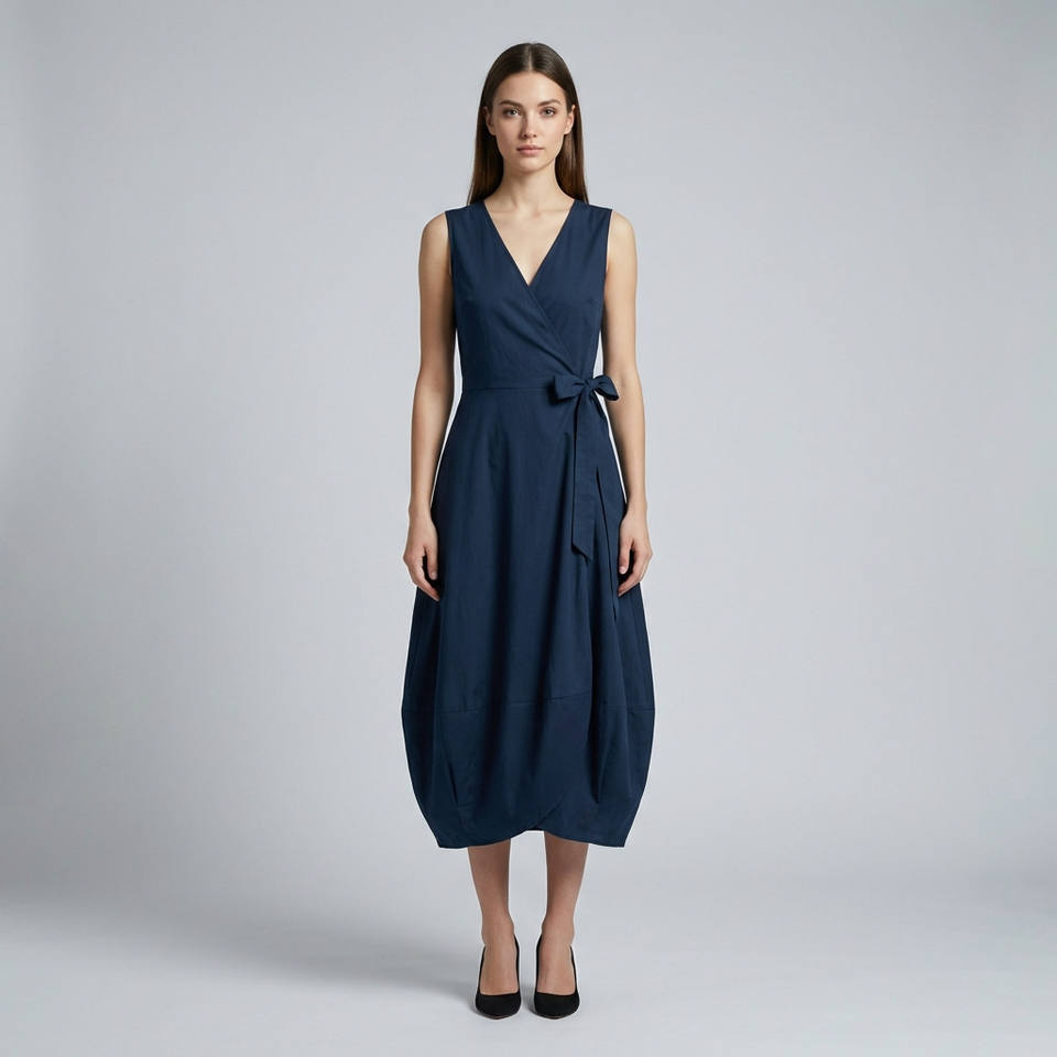 Casual Solid Midi Wrap Dress with Criss-cross Neckline Spandex Functional Pockets Adjustable Bow Natural Waist Washable