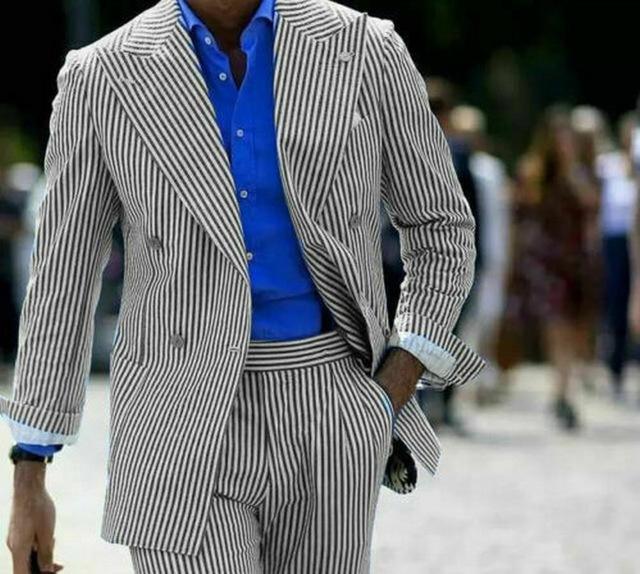 Completo Casual da Uomo in Puro Cotone Morbido a Righe Seersucker, Abito Formale da Matrimonio, Smoking Doppiopetto, Blazer per Feste, 2 Pezzi