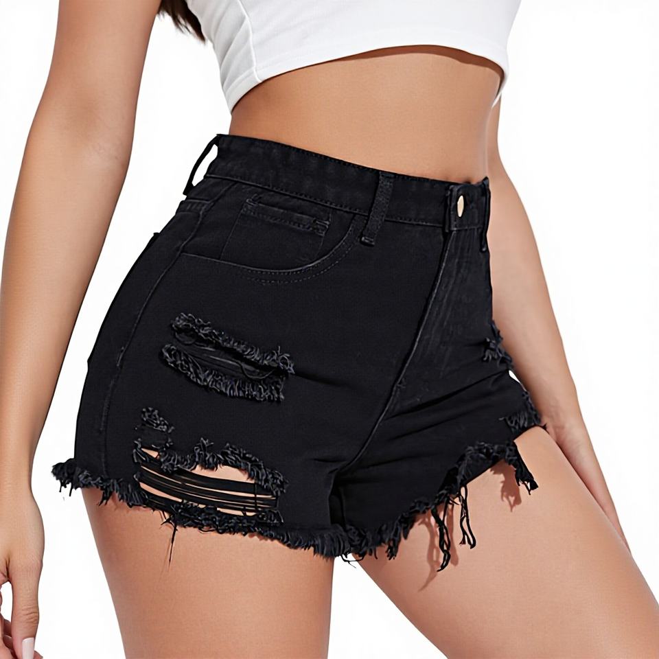 Casual Women's Solid Color Denim Shorts High Waist Asymmetric Distressed Shredded Hole Summer Style Regular Fit