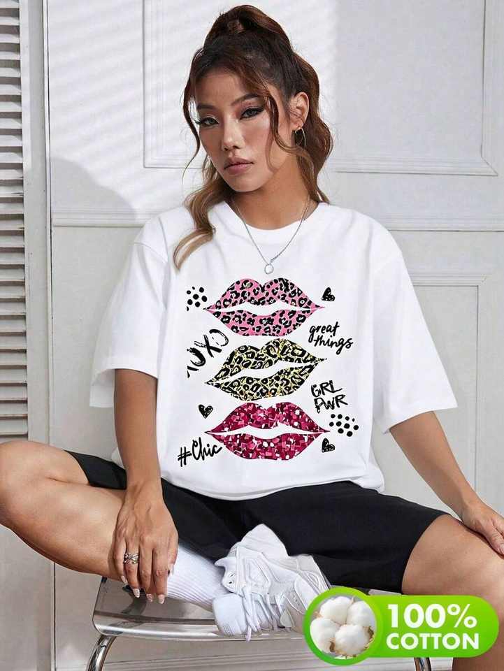 Casual Women's T-Shirt Short Sleeve Pure Cotton Letter Pattern Crew Neck Regular Fit All Seasons Printed Jersey Fabric