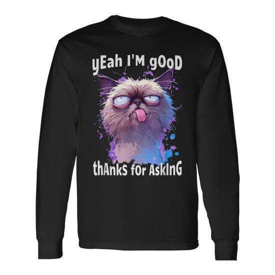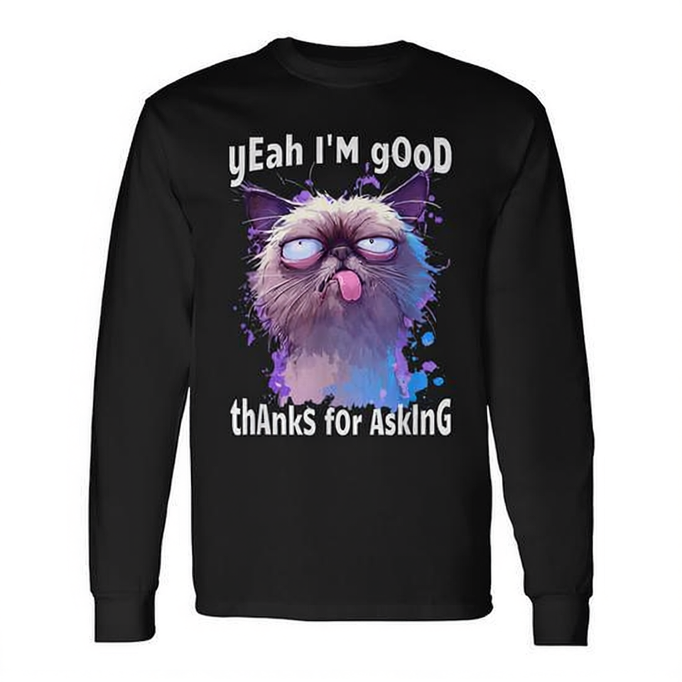 T-shirt a maniche lunghe con stampa digitale Cat Face Meme, girocollo unisex, taglia adulto