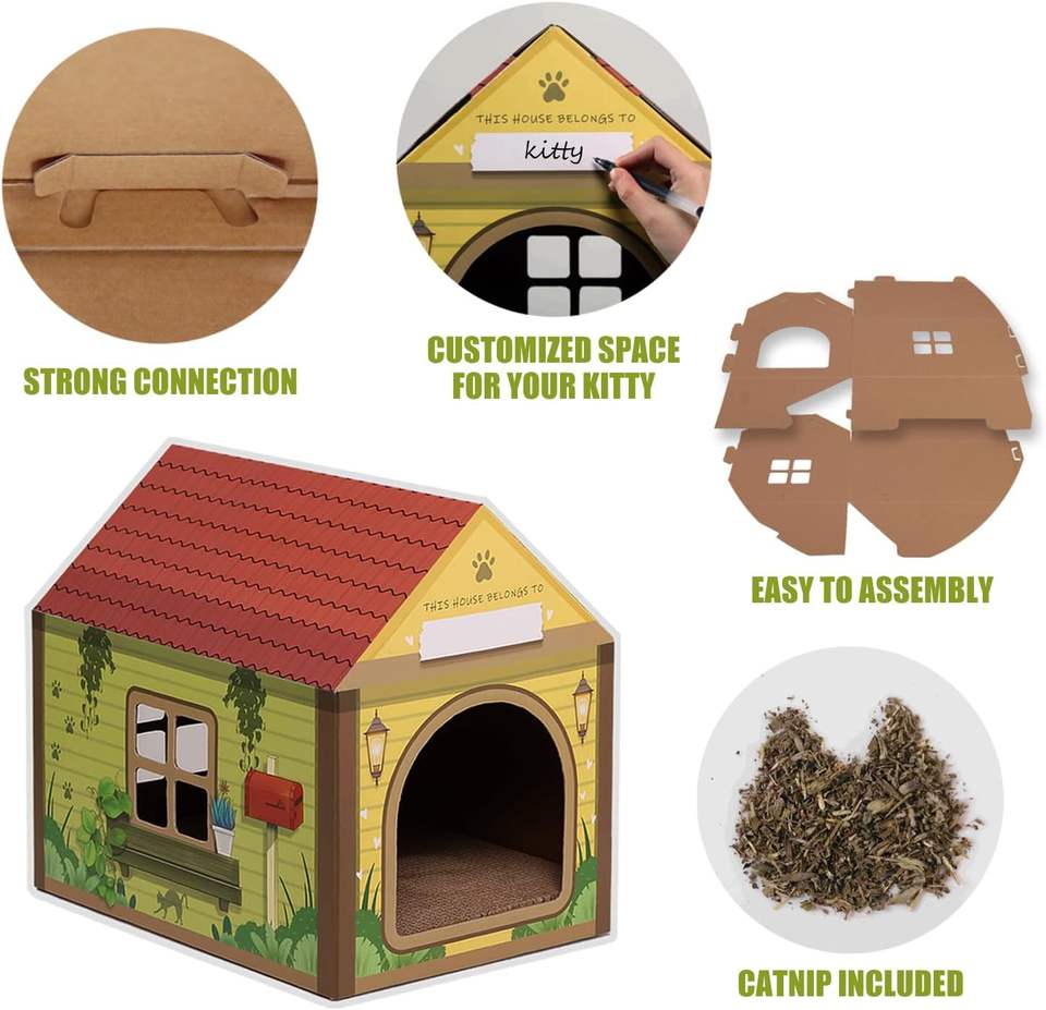 Casetta per Gatti con Tiragraffi e Catnip, 42x30x38 cm, Stile Cabina Forestale, Personalizzabile con Nome, Spazio per Gatti da Interno